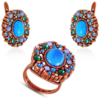 Изготовлено из ювелирного сплава на основе латуни с гальваническим покрытием медью. Изделие украшают бирюза и разноцветные кристаллы. Размер серьги 2.3х2см. Английская застежка.