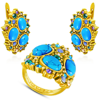 Изготовлено из ювелирного сплава на основе латуни с гальваническим покрытием золотом. Изделие украшают бирюза и разноцветные кристаллы. Размер серьги 2.3х3см. Английская застежка.