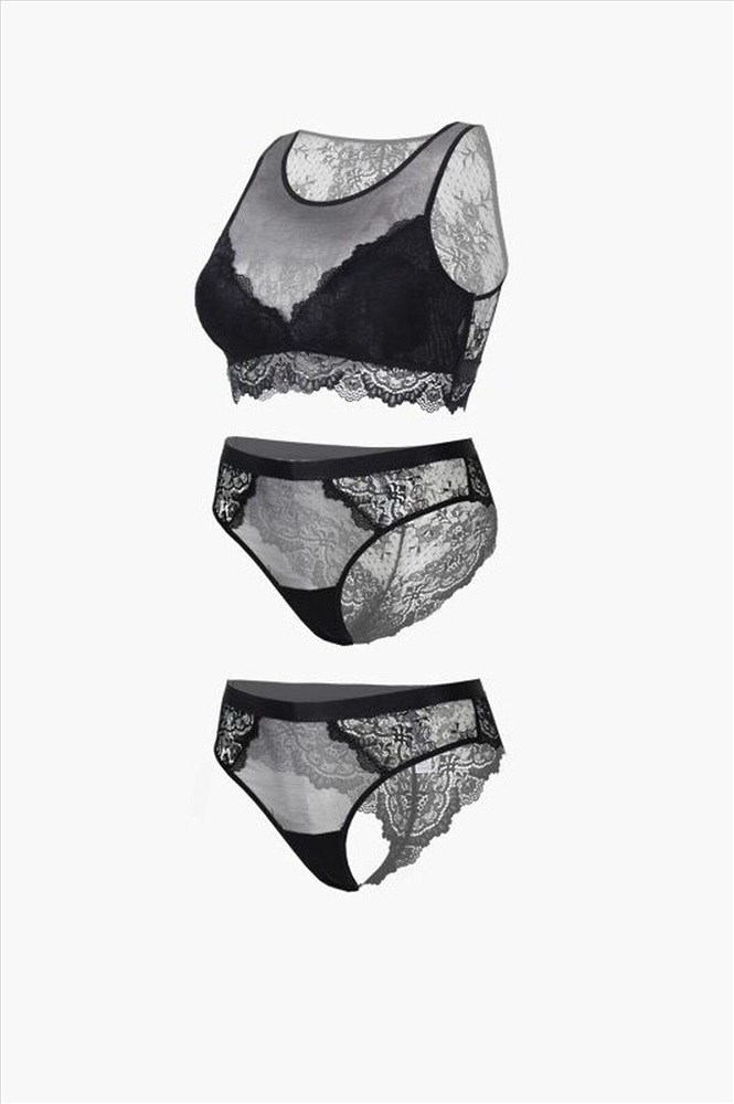 Кружевной бюстгальтер 2040WXY Indefini черный из сетчатой ткани. Бюстгальтер выполнен без косточек, что обеспечивает максимальный комфорт и свободу движений, не сдавливая грудь. Изготовлен из полиамида. Сетчатая ткань бюстгальтера позволяет коже дышать, обеспечивая комфорт на протяжении всего дня. Широкие бретели не врезаются в плечи, а эластичная резинка надёжно фиксирует бюстгальтер на теле, предотвращая сползание. Съёмные чашки-вкладыши обеспечивают дополнительную поддержку и их можно легко убрать при необходимости. Треугольный вырез на спине добавляет изящности к образу, желаемая степень обхвата груди достигается при помощи одного ряда крючка. В комплекте двое трусиков.