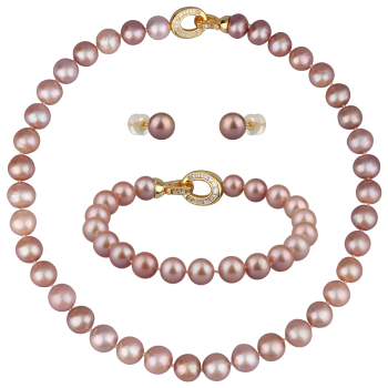 Изготовлено из ювелирного сплава на основе латуни с гальваническим покрытием золотом. Изделие украшает жемчуг диаметром 10-12 мм цвета розовая карамель. Длина колье 45см.Длина браслета 19-20см. Пусеты 10-11мм. *Цвет и форма жемчужин может отличаться от из