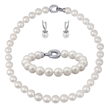 Изготовлено из ювелирного сплава на основе латуни с гальваническим покрытием родием. Изделие украшает жемчуг диаметром 11-12мм белого цвета. Длина колье 44-46см. Длина браслета 18-19см. Пусеты. *Цвет и форма жемчужин может отличаться от изображенной на фо