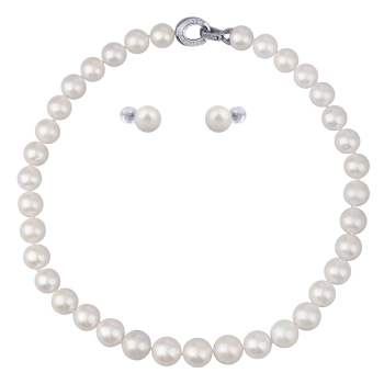 Изготовлено из ювелирного сплава на основе латуни с гальваническим покрытием родием. Изделие украшает жемчуг диаметром 11-13мм белого цвета. Длина колье 44-46см. Пусеты. *Цвет и форма жемчужин может отличаться от изображенной на фото.