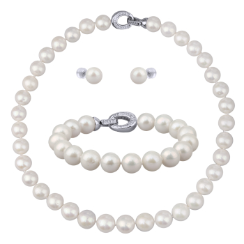 Изготовлено из ювелирного сплава на основе латуни с гальваническим покрытием родием. Изделие украшает жемчуг диаметром 11-14мм белого цвета. Длина колье 44-46см. Длина браслета 18-19см. Пусеты. *Цвет и форма жемчужин может отличаться от изображенной на фо