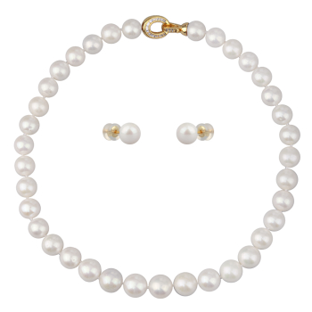Изготовлено из ювелирного сплава на основе латуни с гальваническим покрытием золотом. Изделие украшает жемчуг диаметром 12-14мм белого цвета. Длина колье 45см. Пусеты.*Цвет и форма жемчужин может отличаться от изображенной на фото.
