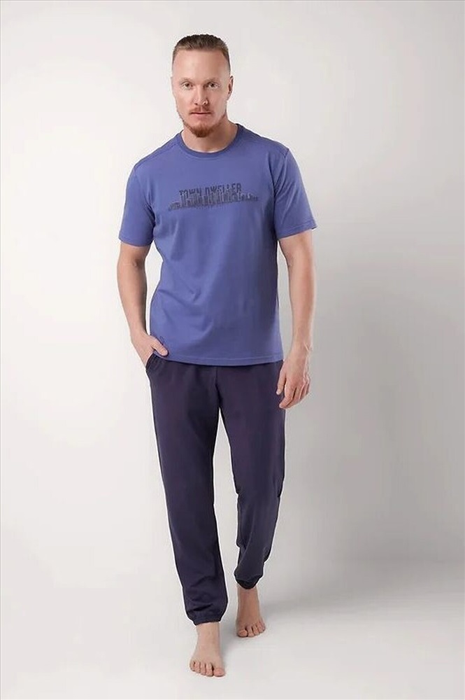 Страна производства: Россия Набор мужской состоящий из футболки и брюк. Футболка из хлопковой кулирной глади с карбоном, коротким рукавом, декоративным резом и принтом. Брюки из плотной кулирной глади на широком поясе с резинкой и регулируемым шнуром, по бокам удобные карманы.