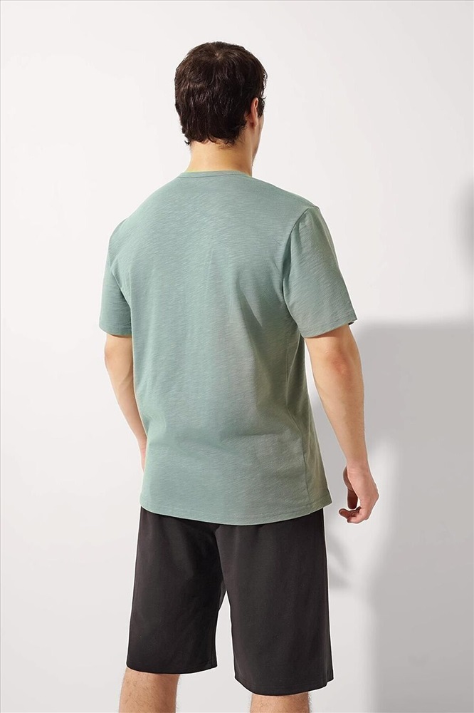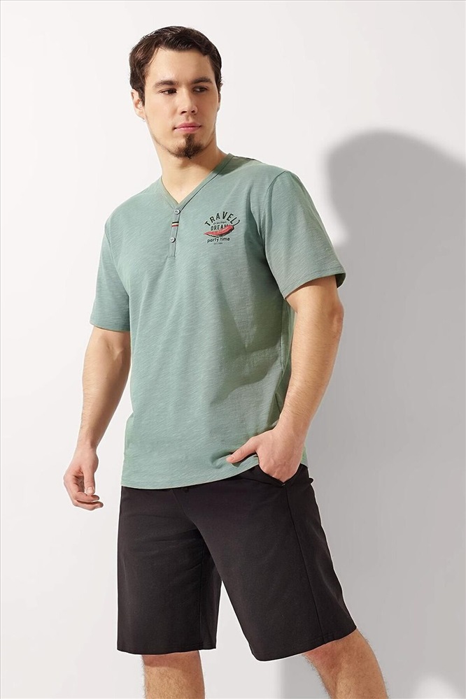 Страна производства: Россия Набор мужской для дома: футболка из хлопкового полотна "флам" с фигурной горловиной с иммитацией планки с дизайнерским принтом. Шорты из трикотажного полотна на широком поясе с резинкой и регулируемым шнуром, по бокам удобные карманы.