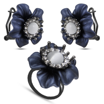 Комплект: кольцо и серьги (улексит, эмаль синяя, кристаллы; черный родий)