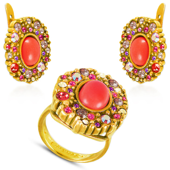 Изготовлено из ювелирного сплава на основе латуни с гальваническим покрытием золотом. Изделие украшают коралл и разноцветные кристаллы. Размер серьги 2.3х2см. Английская застежка.