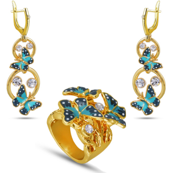 Изготовлено из ювелирного сплава на основе латуни с гальваническим покрытием золотом. Изделие украшают голубая и темно-синяя эмаль, нанесенная вручную и белые кристаллы. Английская застежка. Длина серьги 5.5см. Ширина кольца 3см.