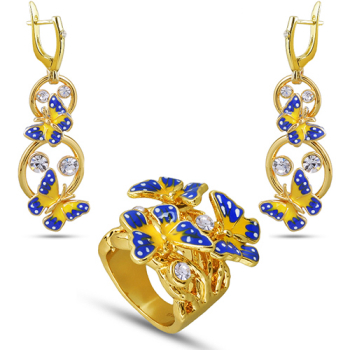 Изготовлено из ювелирного сплава на основе латуни с гальваническим покрытием золотом. Изделие украшают желтая и синяя эмаль, нанесенная вручную и белые кристаллы. Длина серьги 5.5 см. Ширина кольца 3см.