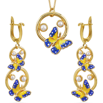 Изготовлено из ювелирного сплава на основе латуни с гальваническим покрытием золотом. Изделие украшают эмаль желтого и синего цвета, нанесенная вручную и белый жемчуг диаметром 3-4мм. Английская застежка. Длина серьги 5.5см. Размер кулона 2.5х2см.