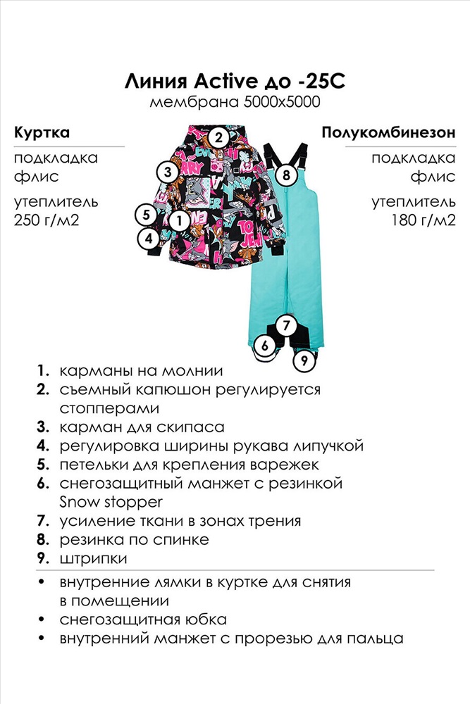 Страна производства: Китай Зимний детский горнолыжный костюм для мальчика. Особенности модели: Линия Active; Температурный режим до -25С; мембрана 5000х5000, Куртка: подкладка - флис; Утеплитель 250 г/м; боковые карманы на молнии; съемный капюшон с утяжкой по ширине резинкой со стопперами; защита подбородка при застегивании молнии; внешняя ветрозащитная планка на липучках; эргономичные рукава; на рукаве карман для скипаса; регулировка ширины рукава липучкой; внутренние лямки для снятия в помещении; снегозащитная юбка с резинкой Snow stopper; Полукомбинезон: Утеплитель 180 г/м подкладка - флис; снегозащитный манжет на брюках с резинкой Snow stopper; усиление по внутреннему шву; резинка по спинке; штрипки; Утепленный горнолыжный комплект - идеальный выбор для активного отдыха на свежем воздухе в зимний период. Инновационный утеплитель и флисовая подкладка сохраняют тепло морозную погоду. Мембранный материал делает этот яркий и модный комбинезон непромокаемым: мембрана не пропускает влагу снаружи, но выводит её изнутри, что крайне важно во время подвижных игр и занятий спортом. Легкий, теплый и удобный, комплект идеально подходит для спорта, лыж, сноуборда и игр на свежем воздухе в холодный период года: зима, поздняя осень и ранняя весна. *Пожалуйста, обратите внимание, что указанный температурный режим является приблизительным и зависит от многих факторов, таких как возраст, физическое состояние, уровень активности ребенка и количество слоев одежды. Время, проведенное на открытом воздухе, и погодные условия, такие как холодный ветер, могут повлиять на тепловые характеристики изделия. Убедитесь, что защищены от холода голова, руки и ноги.