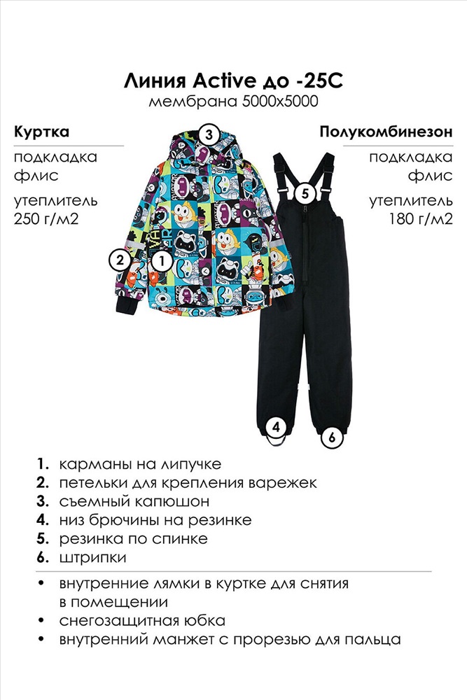 ID товара: 1064612 Состав: Верх- 100% Полиэстер; Мембранное покрытие 5000*5000; Подкладка- флис 100% Полиэстер 200г; Утеплитель- куртка-250г/м2, брюки-180г/м2 Сезон: Осень/Зима Длина: Полная Фасон: Прямой Рукав: длинные Вид застежки: Молния Рисунок: Фантазийный Декоративные элементы: Принт Утеплитель: с утеплителем, куртка-250г/м2, брюки-180г/м2 Стиль: повседневный Реком. темп. режим: до -25ºС Страна бренда: Германия Страна производства: Китай Зимний детский горнолыжный костюм для мальчика. Особенности модели: Линия Active; Температурный режим до -25С; мембрана 5000х5000, Куртка: подкладка - флис; Утеплитель 250 г/м; боковые карманы на липучке; съемный капюшон с адаптацией по ширине резинкой; внешняя ветрозащитная планка на липучках; эргономичные рукава; внутренние лямки для снятия в помещении; снегозащитная юбка с резинкой Snow stopper; Полукомбинезон: Утеплитель 180 г/м подкладка - флис; низ брючины на резинке; резинка по спинке; штрипки; Утепленный горнолыжный комплект - идеальный выбор для активного отдыха на свежем воздухе в зимний период. Инновационный утеплитель и флисовая подкладка сохраняют тепло морозную погоду. Мембранный материал делает этот яркий и модный комбинезон непромокаемым: мембрана не пропускает влагу снаружи, но выводит её изнутри, что крайне важно во время подвижных игр и занятий спортом. Легкий, теплый и удобный, комплект идеально подходит для спорта, лыж, сноуборда и игр на свежем воздухе в холодный период года: зима, поздняя осень и ранняя весна. *Пожалуйста, обратите внимание, что указанный температурный режим является приблизительным и зависит от многих факторов, таких как возраст, физическое состояние, уровень активности ребенка и количество слоев одежды. Время, проведенное на открытом воздухе, и погодные условия, такие как холодный ветер, могут повлиять на тепловые характеристики изделия. Убедитесь, что защищены от холода голова, руки и ноги. Комментарии к товару