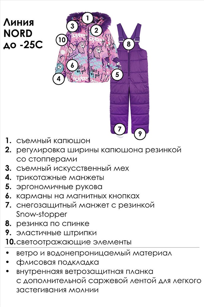 Страна производства: Китай Зимний детский костюм для девочки. Особенности модели: Температурный режим до -25С; Куртка: подкладка - флис; Утеплитель: куртка - 250 г/м боковые карманы на липучке; съемный капюшон с адаптацией по ширине резинкой; съемная меховая опушка; эргономичные рукава; трикотажный манжет Полукомбинезон: Утеплитель 180 г/м подкладка - флис; снегозащитный манжет на брюках с резинкой Snow stopper; усиление по внутреннему шву; резинка по спинке; эластичные штрипки; Утепленный горнолыжный комплект - идеальный выбор для активного отдыха на свежем воздухе в зимний период. Инновационный утеплитель и флисовая подкладка сохраняют тепло морозную погоду. *Пожалуйста, обратите внимание, что указанный температурный режим является приблизительным и зависит от многих факторов, таких как возраст, физическое состояние, уровень активности ребенка и количество слоев одежды. Время, проведенное на открытом воздухе, и погодные условия, такие как холодный ветер, могут повлиять на тепловые характеристики изделия. Убедитесь, что защищены от холода голова, руки и ноги.