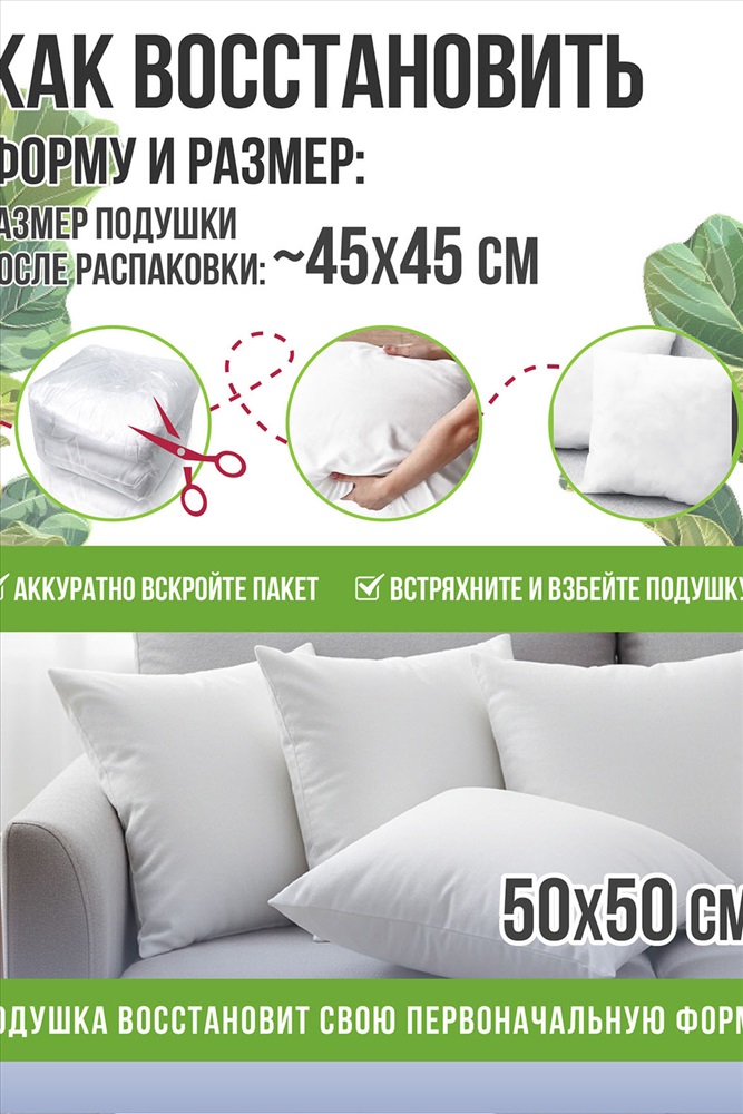 Состав: наполнитель - 100% ПЭ; чехол - 100% ПЭ Модель: Комплект подушек декоративных "ЛАЙТ" (2 шт.) р. 50*50см. Тип товара: подушка декоративная Материал: спанбонд | спанбонд Бренд: Smart Textile Назначение: для дачи Сезонность: лето | осень | весна | зима Создайте уютную атмосферу в вашем доме с нашими стильными декоративными подушками размером 40х40 см. В комплект входят две подушки, которые идеально подойдут для оформления дивана, кресла или кровати. Эти подушки не только дополнят ваш интерьер, но и станут замечательным подарком. Каждая подушка изготовлена с использованием высококачественного наполнителя из файбера, который обеспечивает мягкость и упругость, создавая комфортное ощущение при каждом прикосновении. Подушки сохраняют свою форму даже после длительного использования. Чехол из прочного и дышащего спанбонда устойчив к истиранию, легко чистится и не вызывает аллергических реакций, что делает их идеальными для людей с чувствительной кожей. Эти декоративные подушки выделяются не только качеством, но и универсальным дизайном. Они легко впишутся в любой интерьер, добавляя ему изысканный акцент и стиль. С такими подушками ваш дом станет более уютным и привлекательным, а также создаст атмосферу, способствующую отдыху и расслаблению. Не упустите возможность сделать стильный подарок. Наши декоративные подушки станут отличным дополнением к вашему дому или оригинальным подарком для ваших близких. Закажите комплект прямо сейчас и насладитесь комфортом и стилем, которые они принесут в ваше пространство. Подушки декоративные это не просто аксессуар, это возможность выразить ваш индивидуальный стиль и заботу о близких. Добавьте немного уюта в свою жизнь с нашими подушками! Сделано в Иваново. Доставляется в вакуумной упаковке, перед использованием ее необходимо хорошо взбить для восстановления формы. Таблица размеров и веса