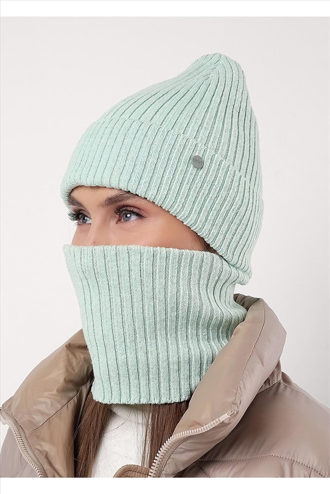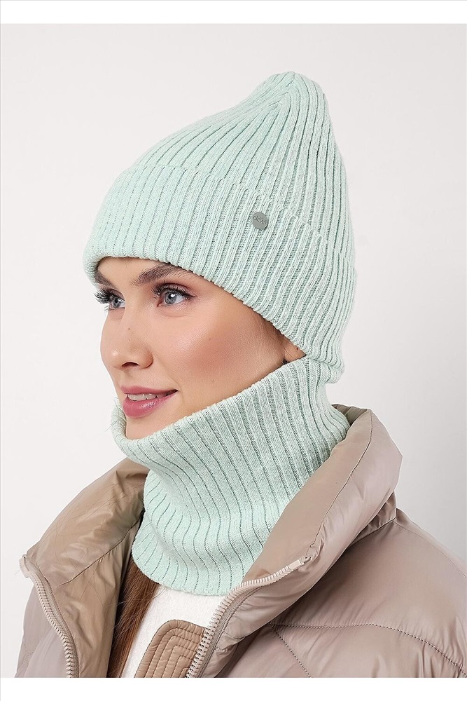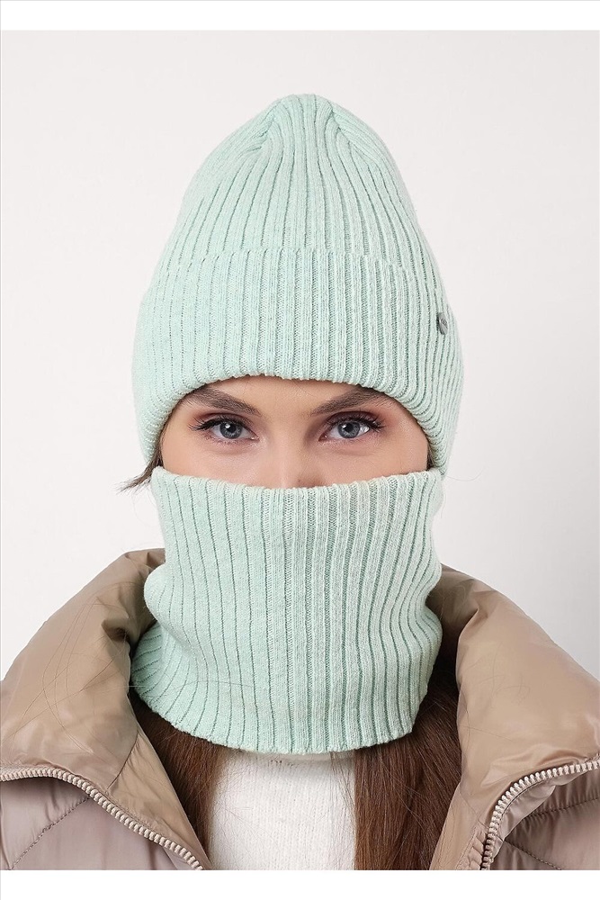 Женская шапка со снудом, декорирована стильной нашивкой в височной зоне. Выполнена из высококачественной пряжи с добавлением шерсти. Утепление флисом по всей голове. Отлично подойдёт для холодной зимы.