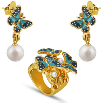 Изготовлено из ювелирного сплава на основе латуни с гальваническим покрытием золотом. Изделие украшают белый жемчуг диаметром 10мм и эмаль синего и голубого цвета. Размер серьги 3х1.5см. Застежка-гвоздики. Размер украшения кольца 3х2.5см.