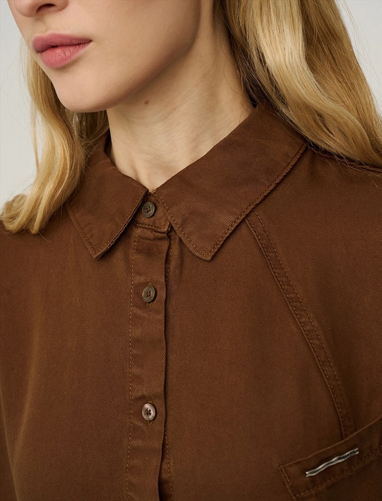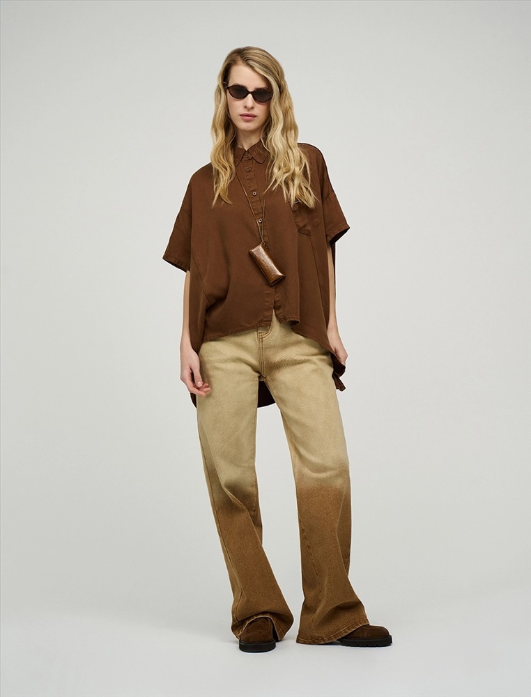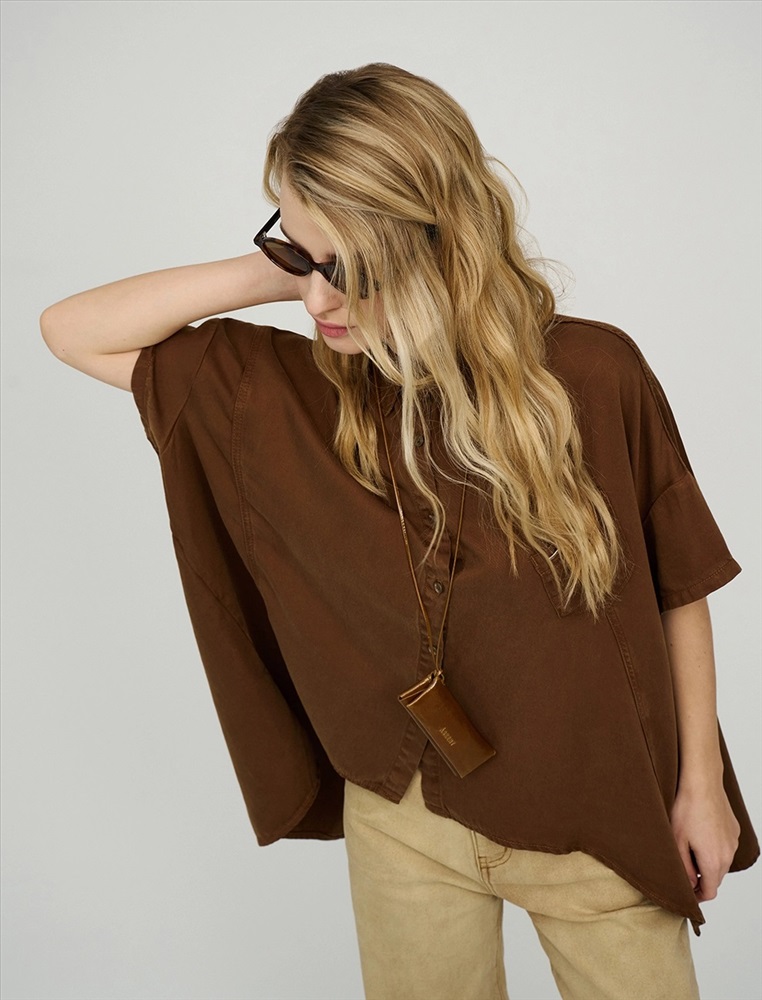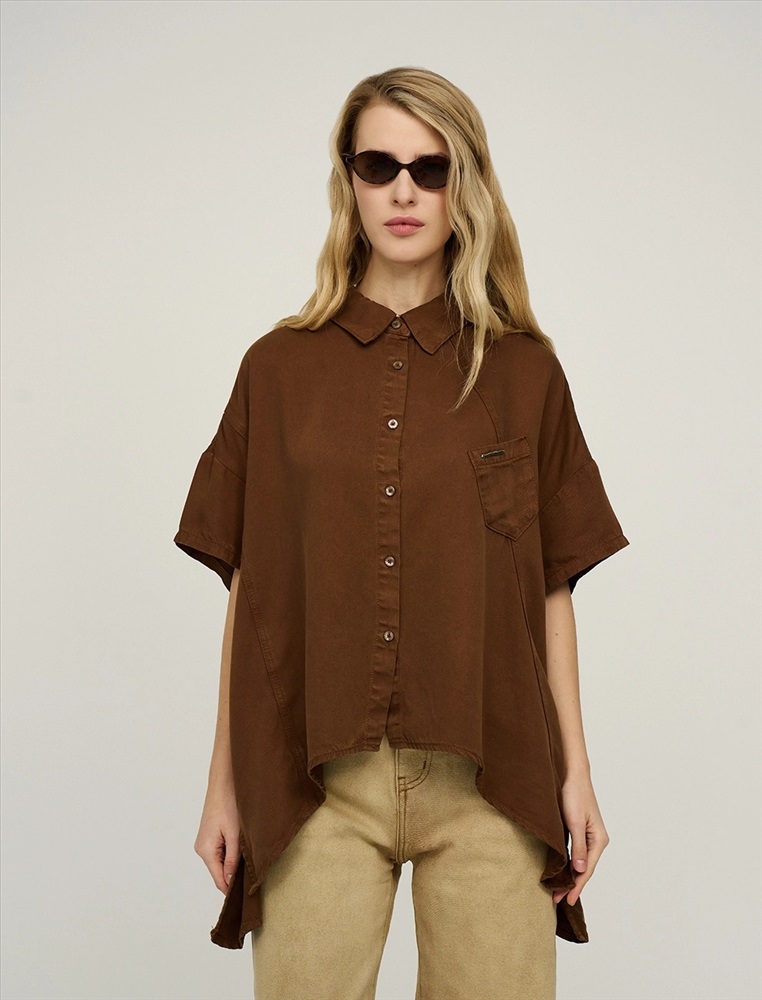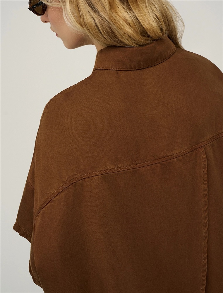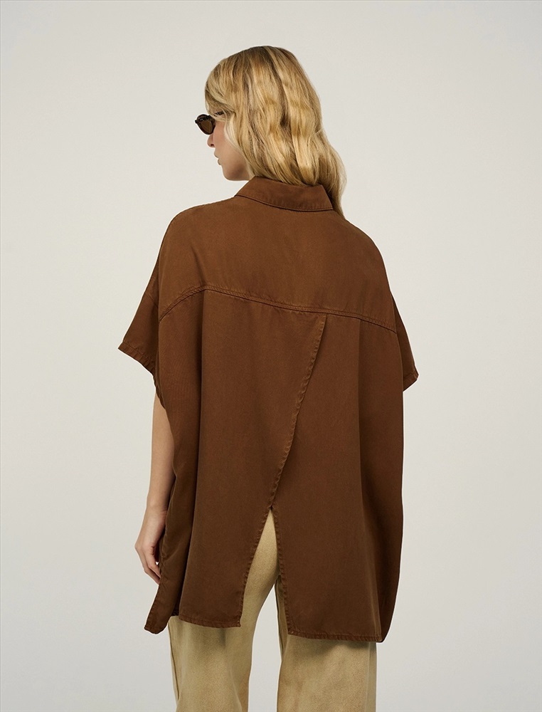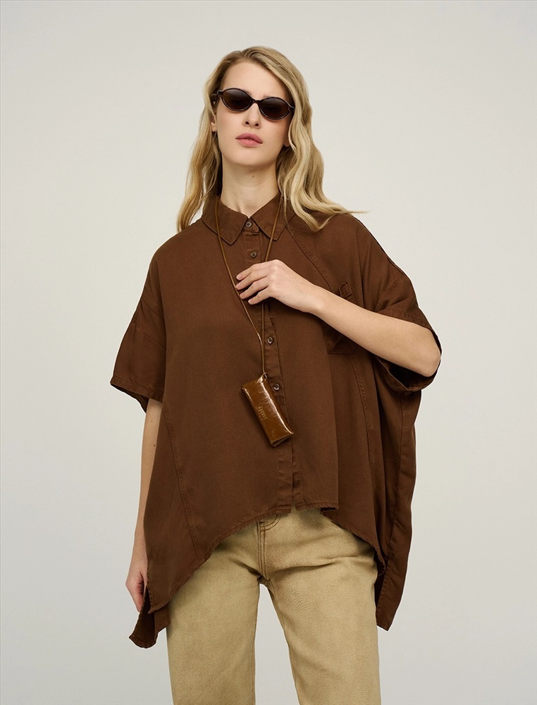 Видео: https-//hassfashion.ru/upload/iblock/bb2/5lt2izlui0uqnrkb574973j2zkfk823r.mp4 весна-лето 66% Хлопок, 22% Полиэстер, 12% Тенсел Рубашка оверсайз силуэта с отложным воротником и короткими рукавами. Линия плеча спущена. По передней части изделия — планка с застежкой на пуговицы, диагональные рельефные швы и накладной карман с брендированным аксессуаром. Фигурный низ изделия с разрезами в боковых швах. По спинке изделия отрезная кокетка и две диагональные отлетные детали, которые формируют красивый вырез по спинке. Выполнена из хлопка, полиэстера и тенсела. Представлена в коричневом оттенке.