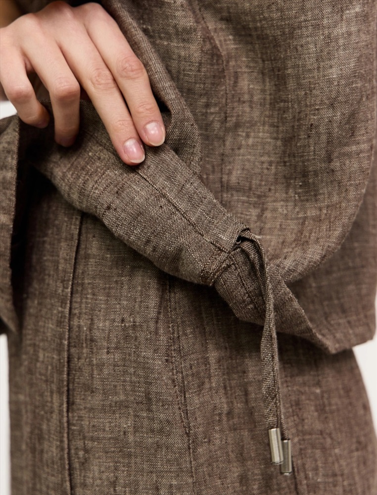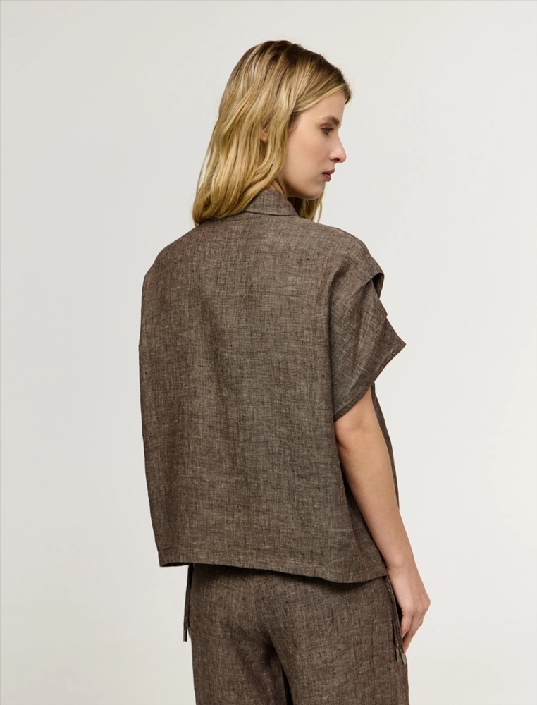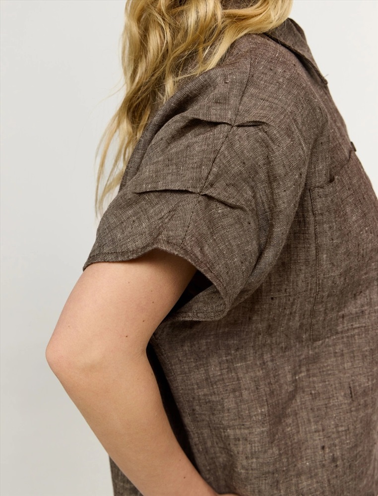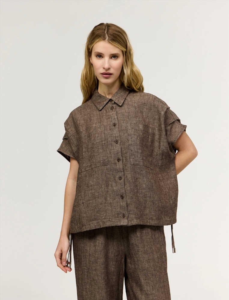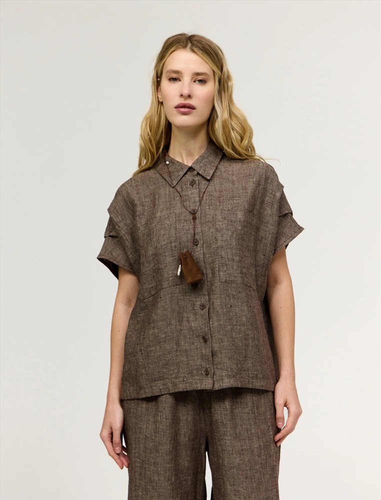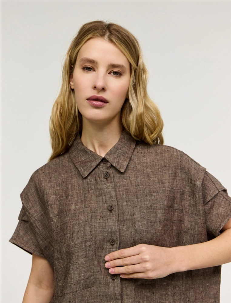 Рубашка прямого силуэта с короткими цельнокроеными рукавами. По горловине отложной воротник. По передней части изделия застежка на пуговицы. Выполнена из 100% льна. Представлена в бежевом и коричневом оттенке.