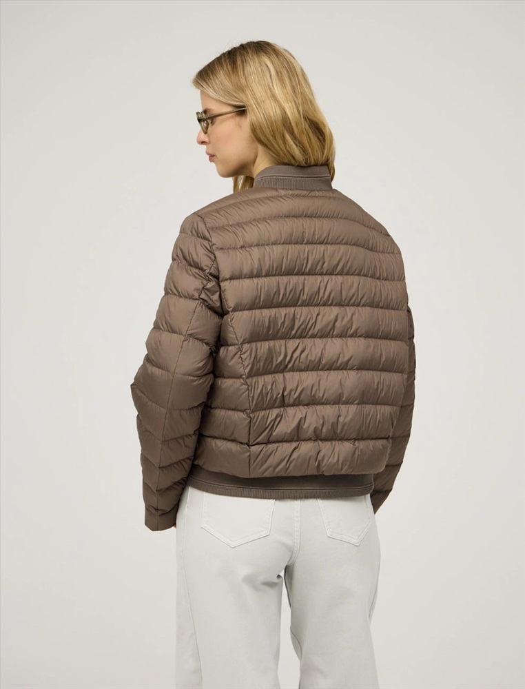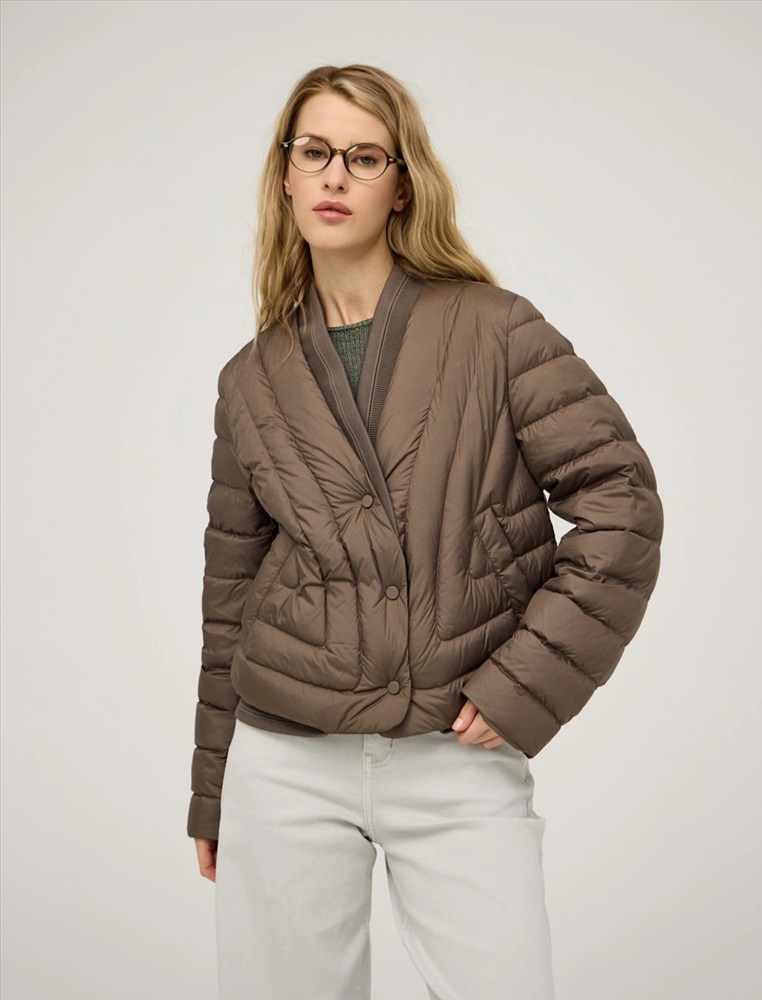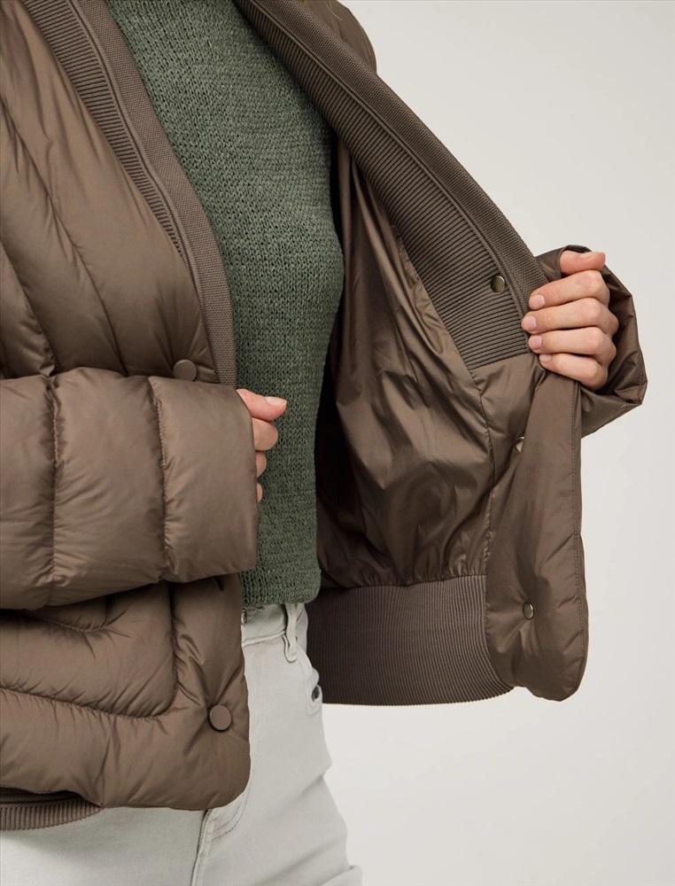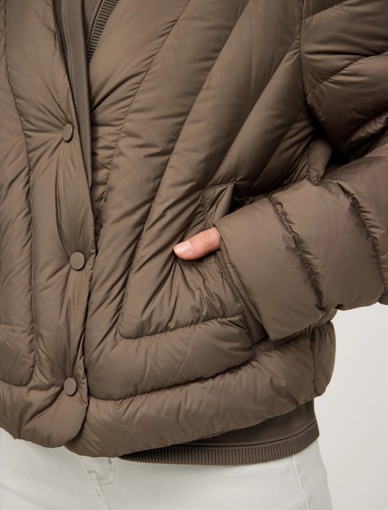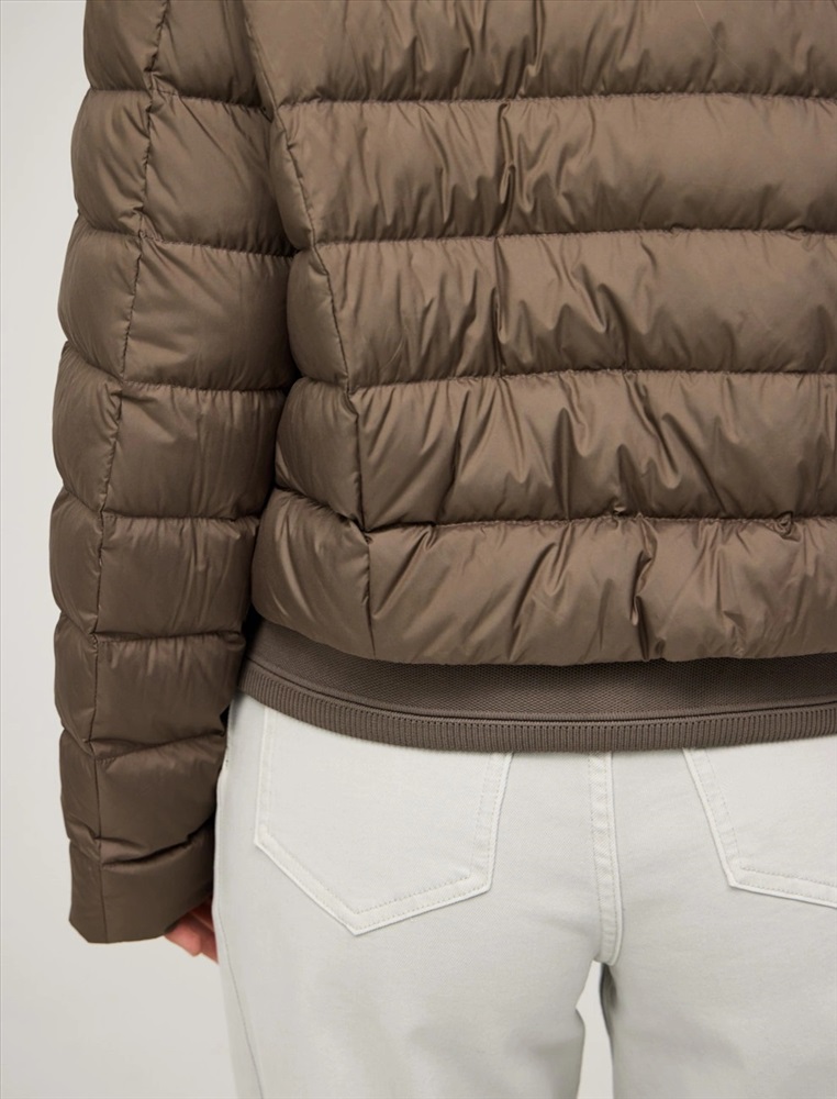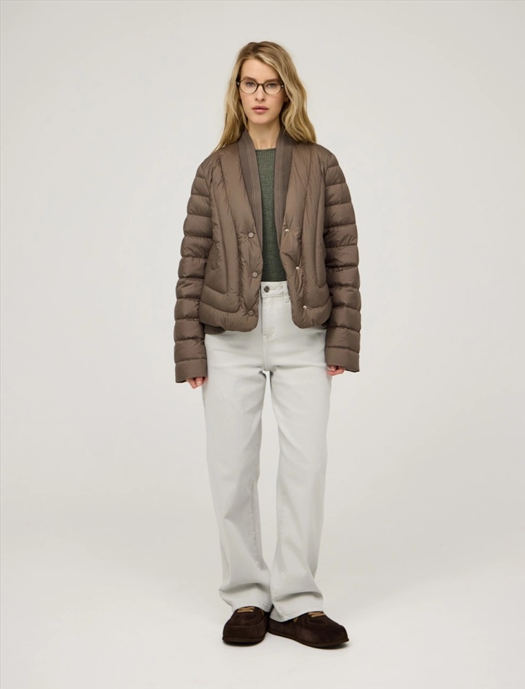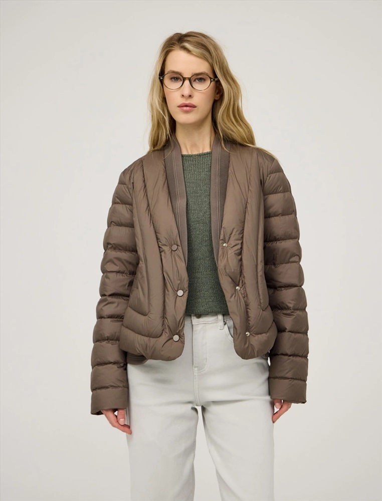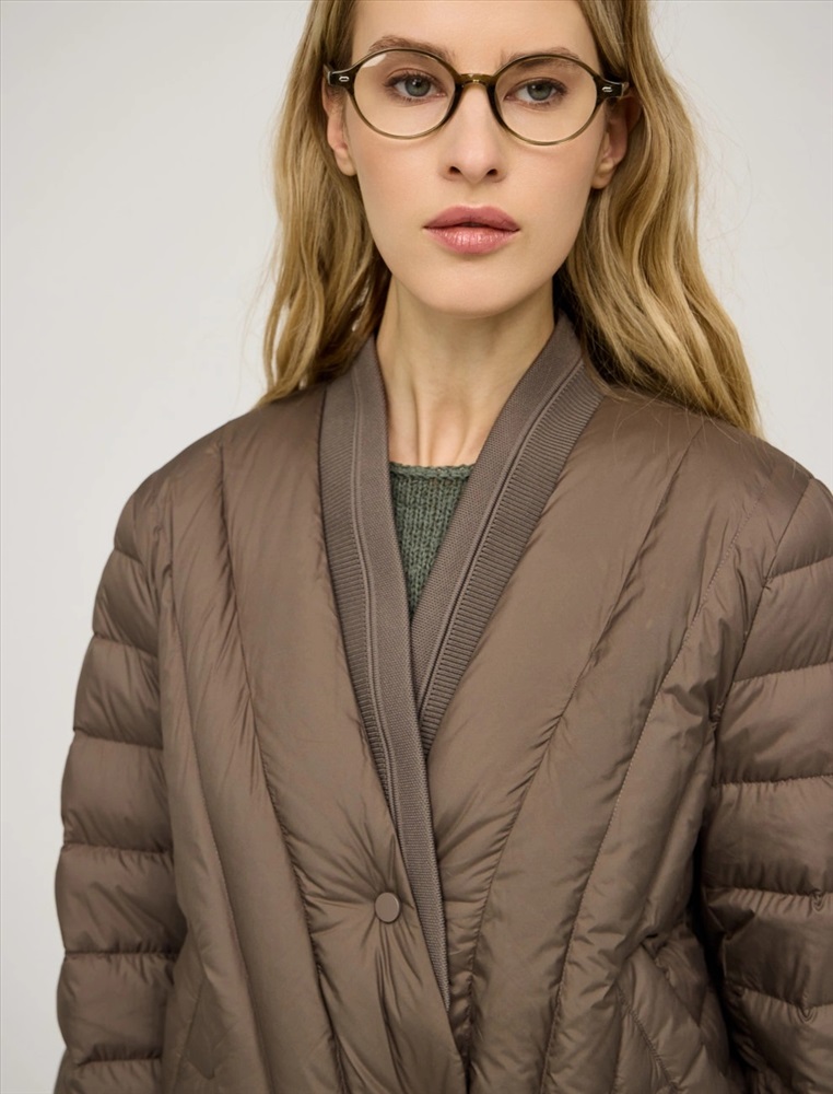 Стеганая куртка регулярного силуэта с трикотажным шалевым воротником. По передней части изделия застежка на кнопки и два прорезных кармана-листочки. В составе утеплителя утиный пух (90%) и утиное перо, обеспечивающие тепло и легкость в носке. Трикотажная вставка по низу изделия дополнительно защищает от холода. Ткань верха и подкладка выполнены из полиэстера. Представлена в молочном и коричневом оттенке.