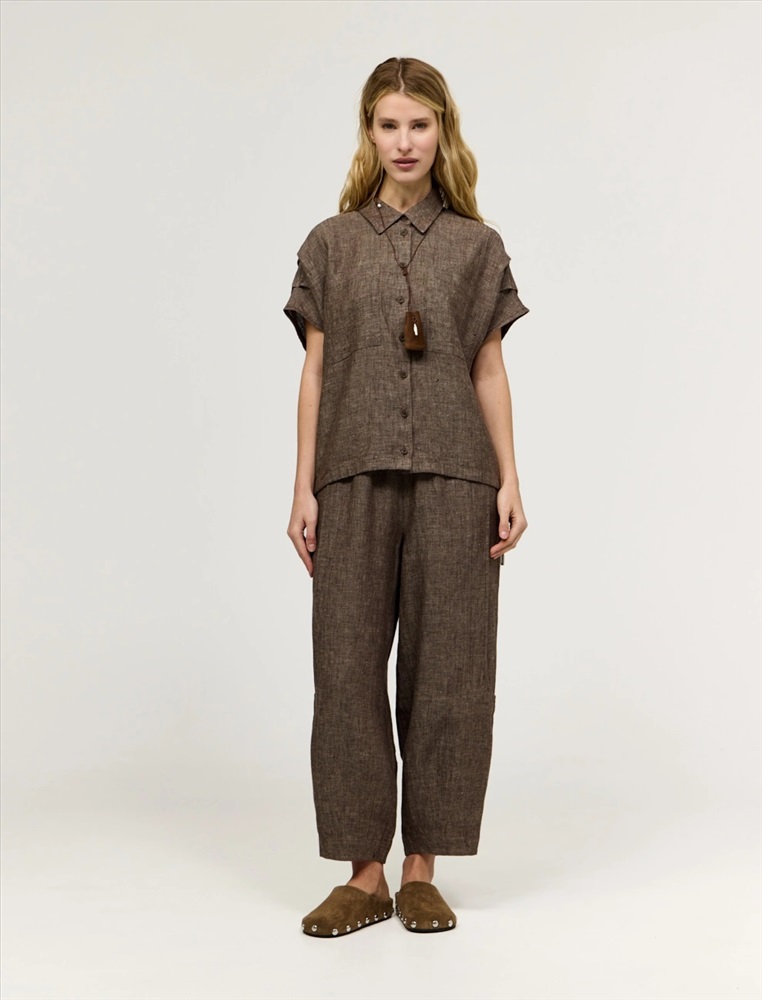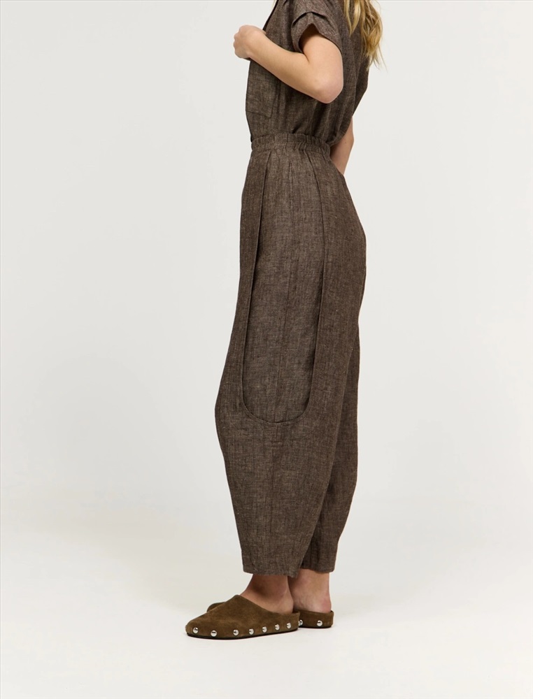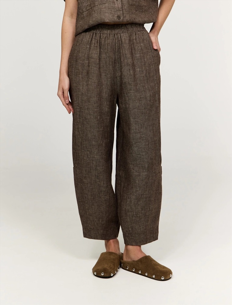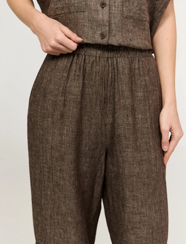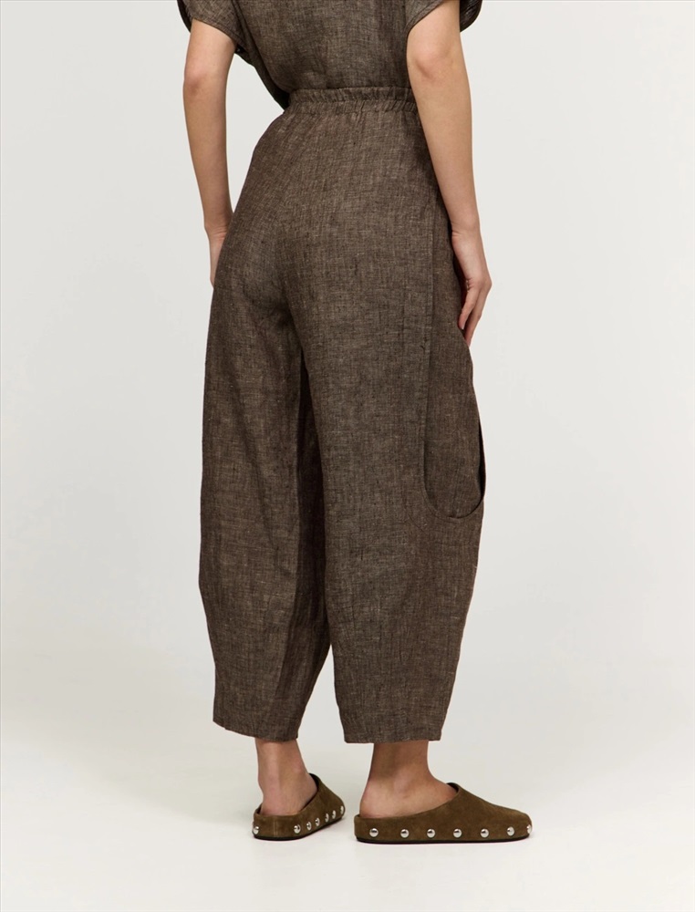 Брюки-алладины зауженного к низу силуэта, на средней посадке. По поясу эластичная резинка. По бокам косые карманы и рельефные швы. Выполнены из 100% льна. Представлены в бежевом и коричневом цветах.