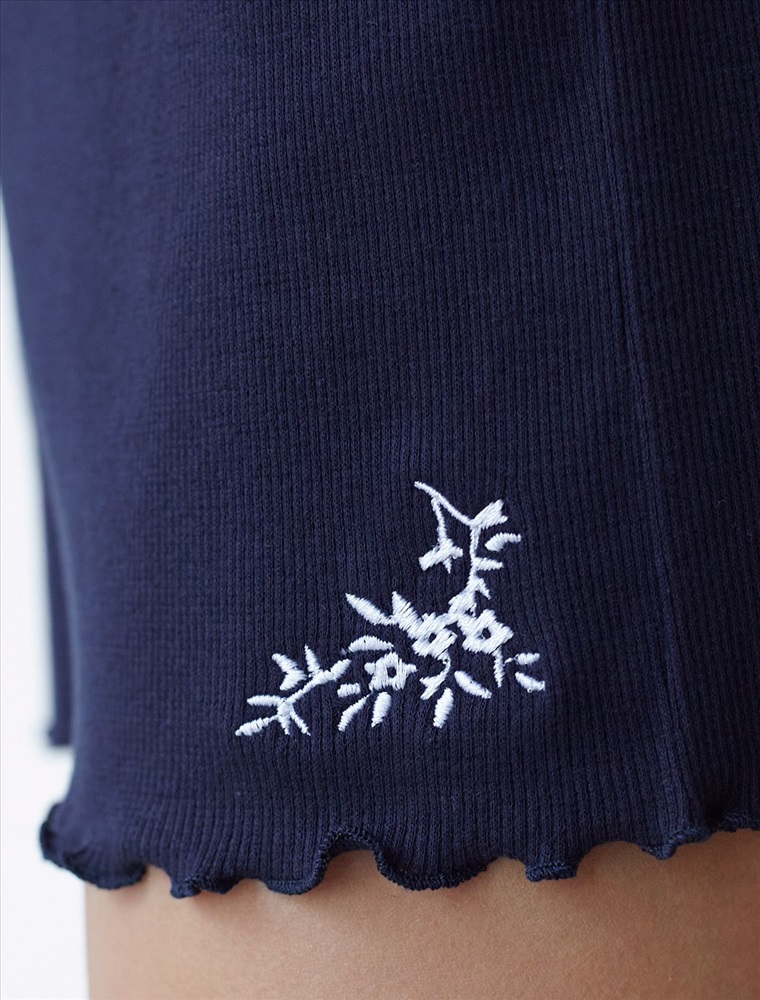 Трикотажные милые шорты темно-синего цвета выполнены из трикотажа в мелкий рубчик. Особенность полотна - трикотаж кашкорсе удивительной мягкости, намного мягче стандартных вариантов, подходящий для расслабленных домашних и пижамных образов. Хлопок обеспечивает максимальный комфорт даже в течение длительного времени и позволяет коже дышать, а эластан в составе позволяет свободно двигаться и подстраивается под особенности фигуры. Красивые пижамные шорты выполнены с поясом на эластичной резинке — это обеспечивает комфортную посадку на любую фигуру, а так же на большие размеры. Контрастный принт в виде цветов делает шортики более привлекательными и особенными, добавляя легкости и игривого настроения. Небольшой рюш по краю шорт подчеркивает женственность обладательницы.