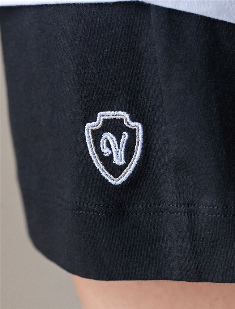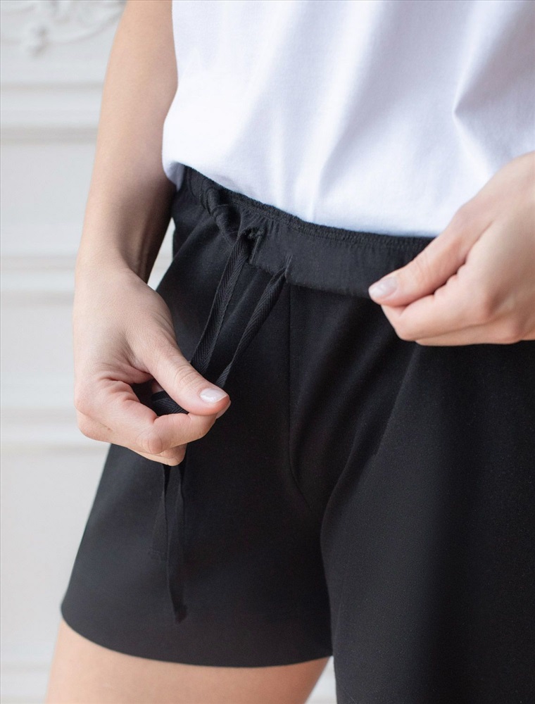 Короткие шорты черного цвета с поясом на резинке выполнены из 100% хлопка плотностью 140 Г/м2. Главная особенность этого изделия — тонкое кулирное полотно, которое легче и воздушнее стандартного трикотажа. Благодаря своей деликатной текстуре модель идеально подходит для домашних образов и пижамных комплектов. Ткань отлично «дышит», обеспечивая максимальный уют во время сна и отдыха. Эластичный пояс на резинке мягко фиксирует шорты на фигуре, что делает их удобными для ежедневного ношения. Шорты подойдут на маленькие и большие размеры. Декоративным элементом является вышивка по авторскому эскизу дизайнера — буква V, оформленная вензельным шрифтом. Сама вышивка выполнена техникой «застил» машинным способом. Такой декоративный элемент добавляет премиальности изделию. Базовые шорты прекрасно подходят для спокойного отдыха дома, занятий йогой или прогулок на свежем воздухе за городом.