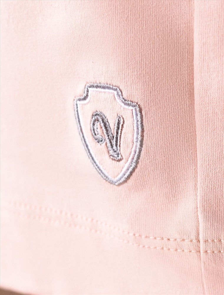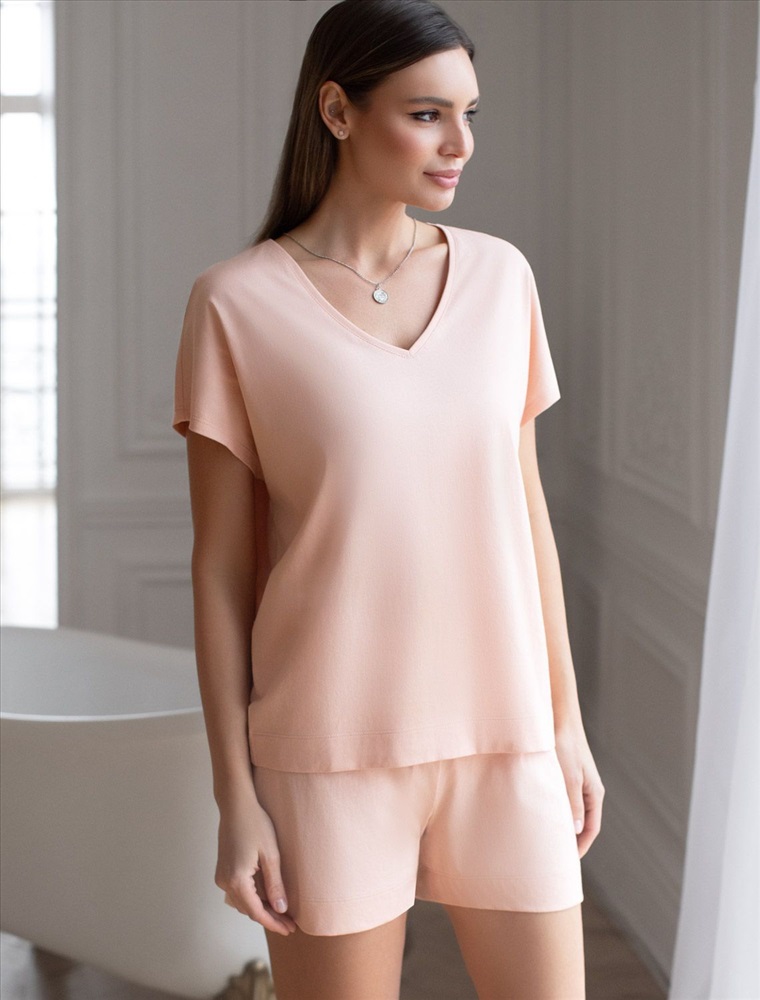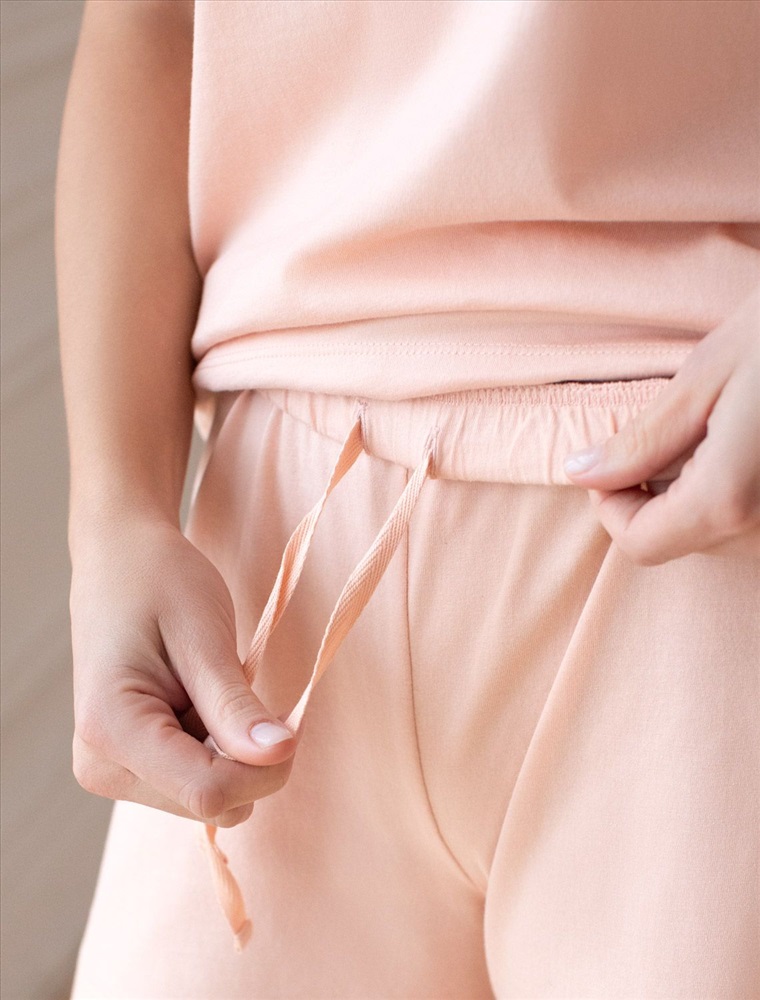 Плотность: 140 Г/м2 Короткие шорты пудрового цвета с поясом на резинке выполнены из 100% хлопка плотностью 140 Г/м2. Главная особенность этого изделия — тонкое кулирное полотно, которое легче и воздушнее стандартного трикотажа. Благодаря своей деликатной текстуре модель идеально подходит для домашних образов и пижамных комплектов. Ткань отлично «дышит», обеспечивая максимальный уют во время сна и отдыха. Эластичный пояс на резинке мягко фиксирует шорты на фигуре, что делает их удобными для ежедневного ношения. Шорты подойдут на маленькие и большие размеры. Декоративным элементом является вышивка по авторскому эскизу дизайнера — буква V, оформленная вензельным шрифтом. Сама вышивка выполнена техникой «застил» машинным способом. Такой декоративный элемент добавляет премиальности изделию. Базовые шорты прекрасно подходят для спокойного отдыха дома, занятий йогой или прогулок на свежем воздухе за городом. Рекомендуем сочетать с артикулами: D43.232, D43.233, D43.234, D49.150, D49.151, D49.152, D49.153, D49.154, D49.157, D49.158 Комментарии к товару