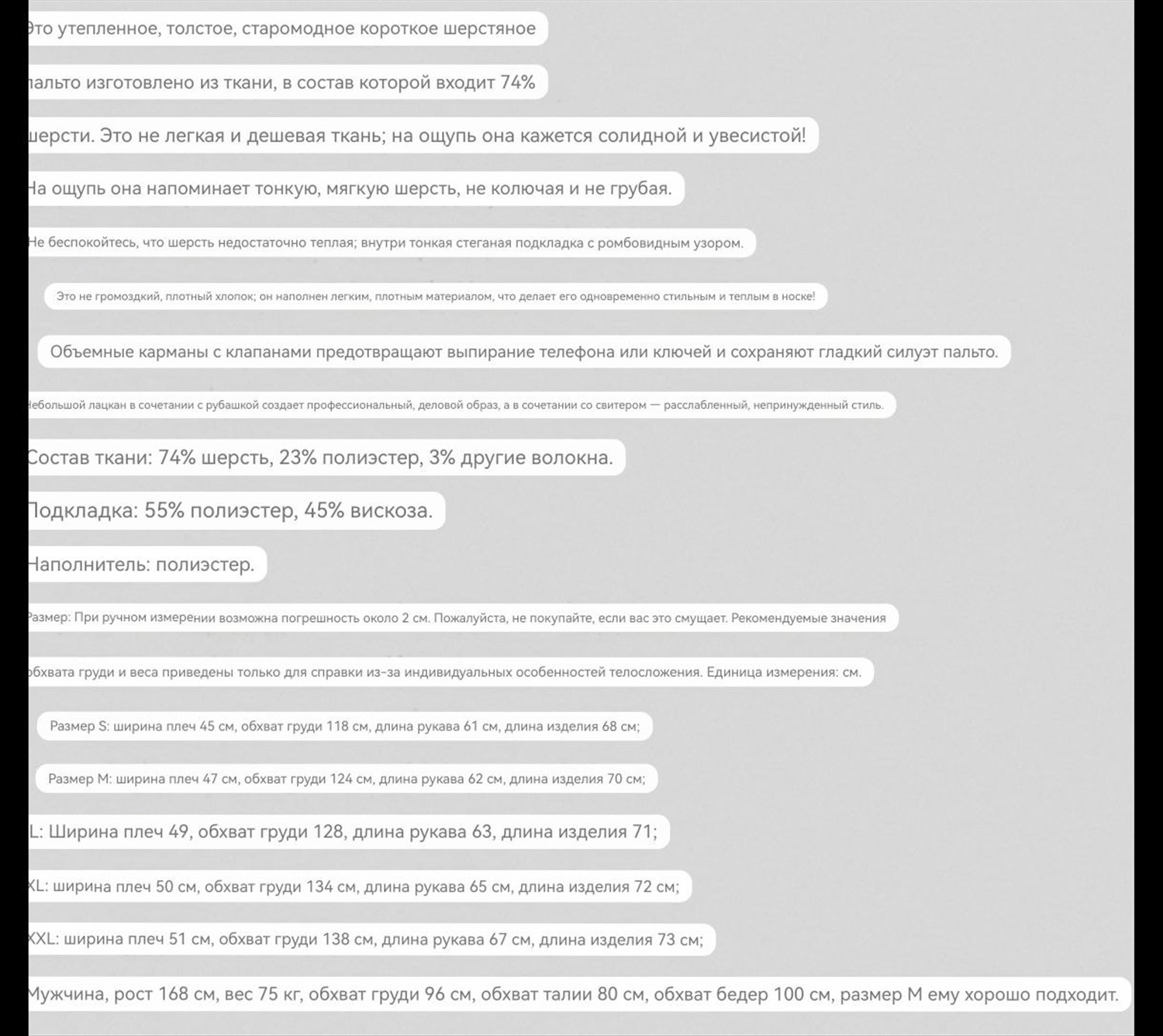 Материал: шерсть 74%, полиэстер23%, другие волокна 3% Размеры: S L XL 2XL Вес ~1,3кг Комментарии к товару