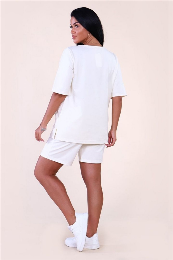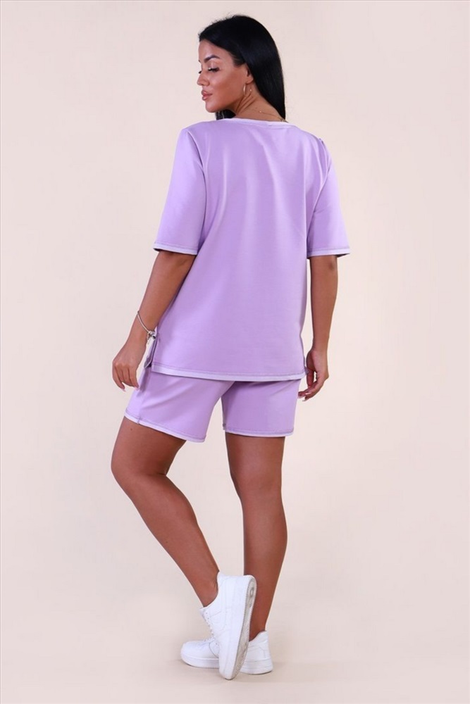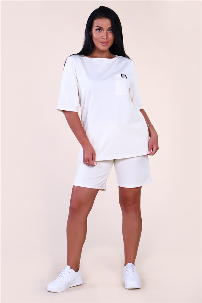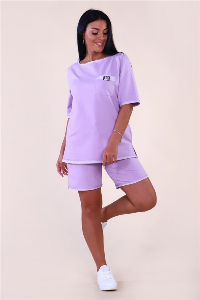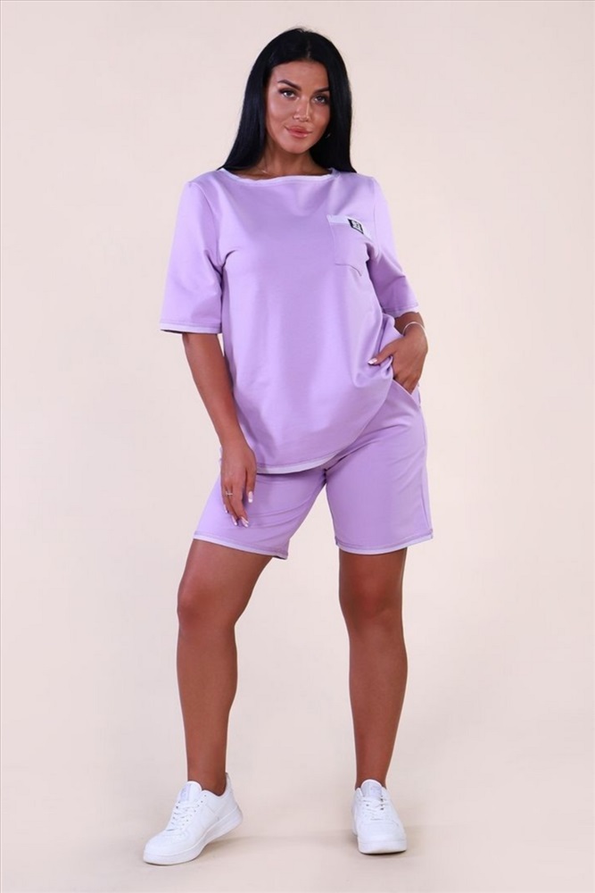 Застежка: без застежки Женский костюм состоит из футболки и шорт, выполнен из мягкого и приятного на ощупь материала футер 2-х нитка. В состав входят 70% хлопка, 24% полиэстера и 6% эластана, что обеспечивает комфорт и хорошую посадку. Футболка украшена нагрудным карманом со стильной нашивкой Brooklyn 83, что добавляет оригинальности и лаконичности образу. Шорты имеют удобные карманы, что делает этот комплект практичным и подходящим для повседневной носки, активного отдыха или просто для домашнего уюта. Такой костюм отлично подойдет для удобного и стильного образа в теплую погоду. * Допускается незначительное отличие оттенка.