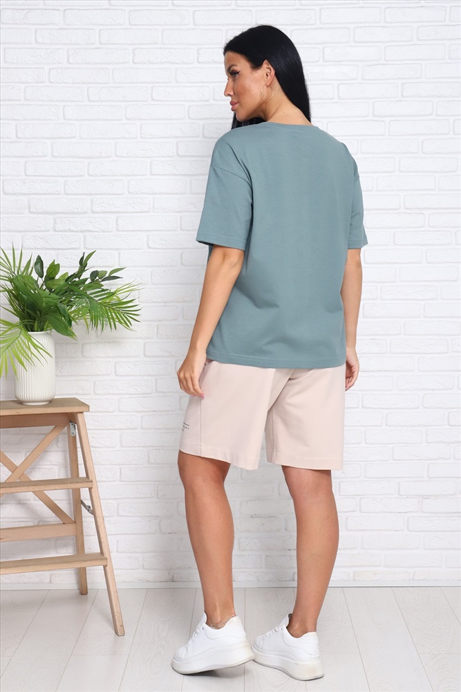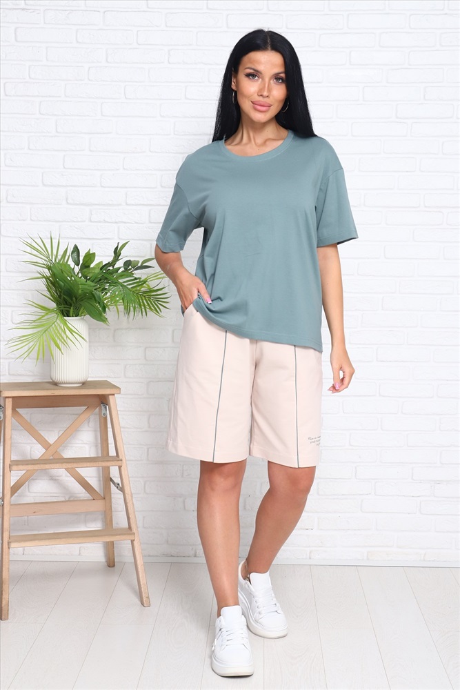 Застежка: без застежки Костюм женский с шортами: футболка (кулирка) с коротким рукавом, спущенное плечо, шорты (футер 2-х нитка) с кантом спереди, с принтом и боковыми карманами. Актуальный силуэт, благородная расцветка и комфортные материалы.