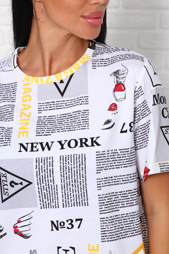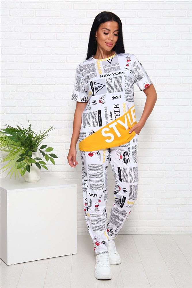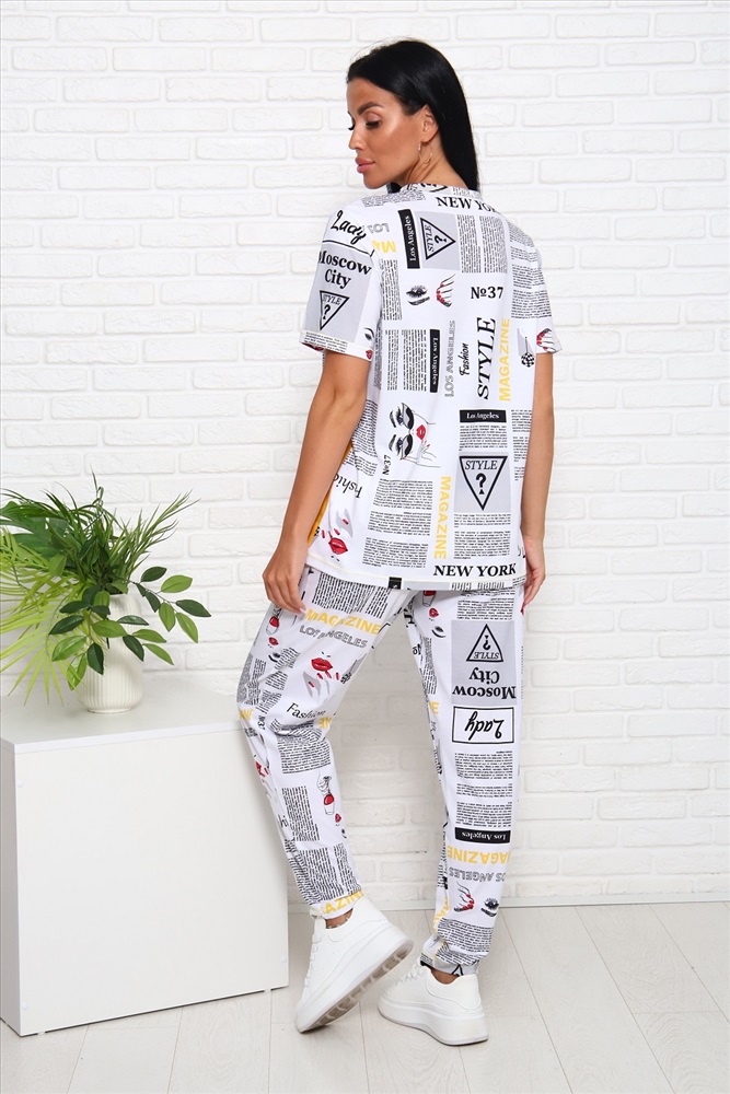 Застежка: без застежки Костюм женский с брюками, материал в стилистике Газетка. Футболка с короткими рукавами, полочка оригинального кроя с крупным принтом - надписью. Брюки на комфортном поясе, с боковыми карманами. Комфорт 100% хлопка.