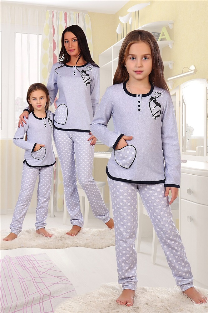 Костюм из интерлока пенье для девочек футболка с длинным рукавом + брюки. Принт на футболке в виде кошечки и сердец, накладной карман в форме сердца, черная окантовка, воротник на кнопках. Брюки в белый горох. Три расцветки — голубая, розовая и серая