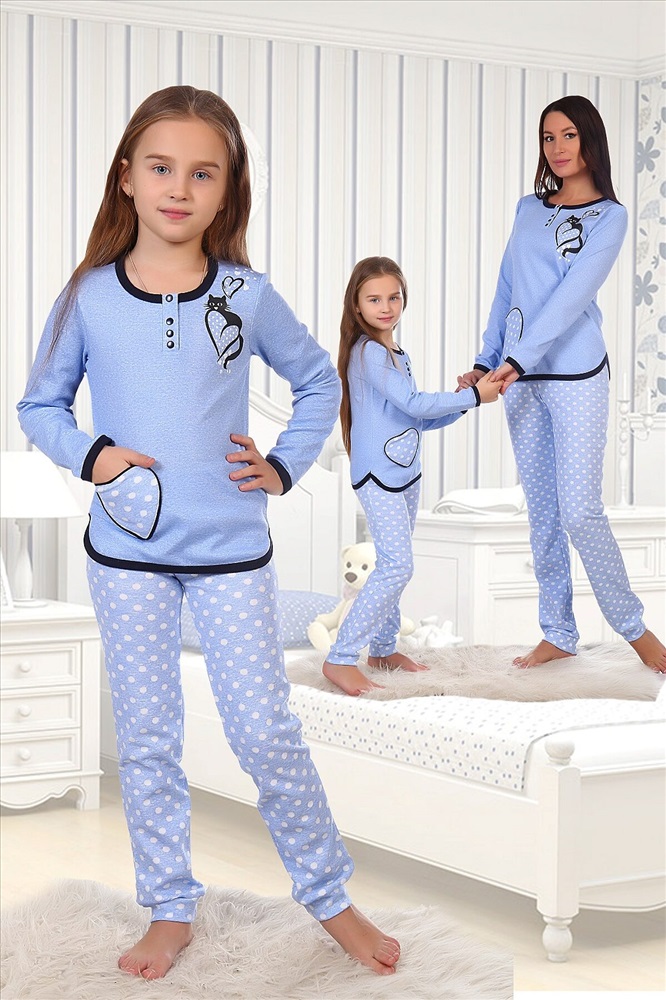 Костюм из интерлока пенье для девочек футболка с длинным рукавом + брюки. Принт на футболке в виде кошечки и сердец, накладной карман в форме сердца, черная окантовка, воротник на кнопках. Брюки в белый горох. Три расцветки — голубая, розовая и серая