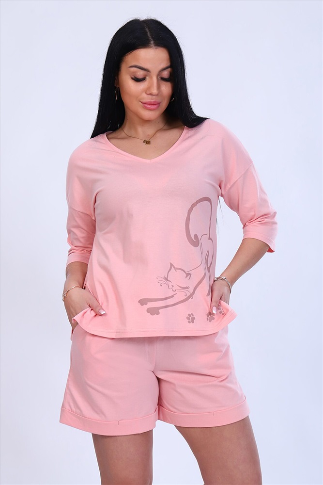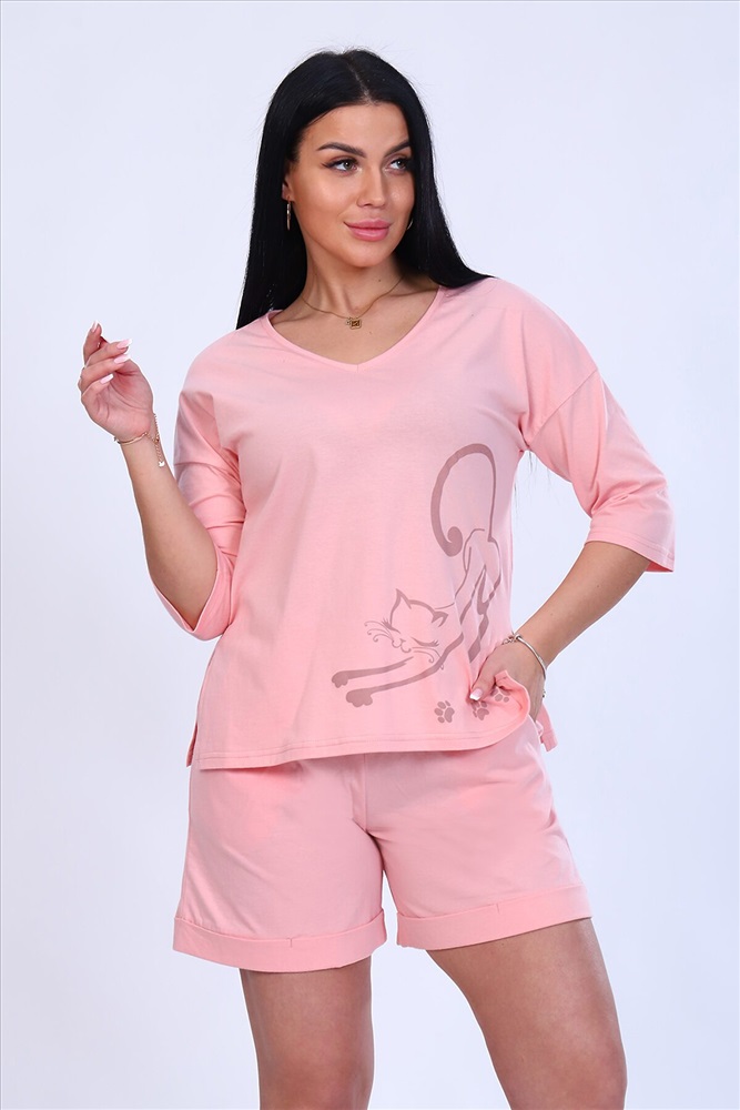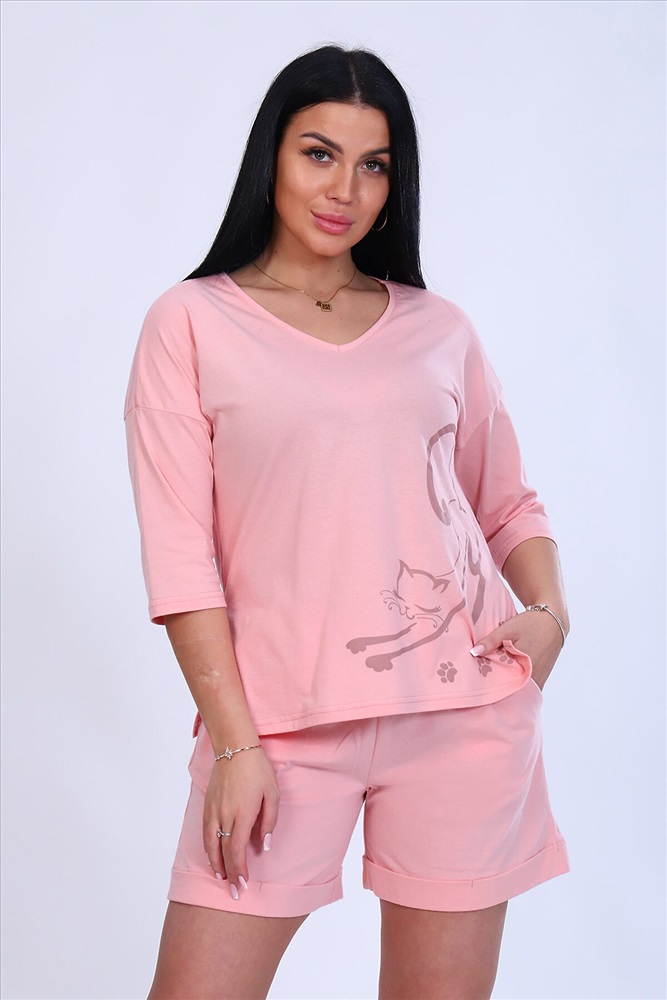 ID товара: 824582 Состав: 100% Хлопок Сезон: Демисезон Длина: Средняя Фасон: Полуприлегающий Рукав: 3/4 Декоративные элементы: Печатный принт Основная ткань: Хлопок | Кулирка Стиль: Повседневный Страна бренда: Россия Страна производства: Россия Красивый и стильный комплект футболка + шорты. Футболка с V - образным вырезом и разрезами по бокам, прямой крой обеспечивает идеальную посадку на любой тип фигуры. Шорты объёмные с карманами в боковых швах, с мягкой резинкой на талии, с манжетой по низу и высокой комфортной посадкой. Длина рукава с учетом длины плеча. Комментарии к товару