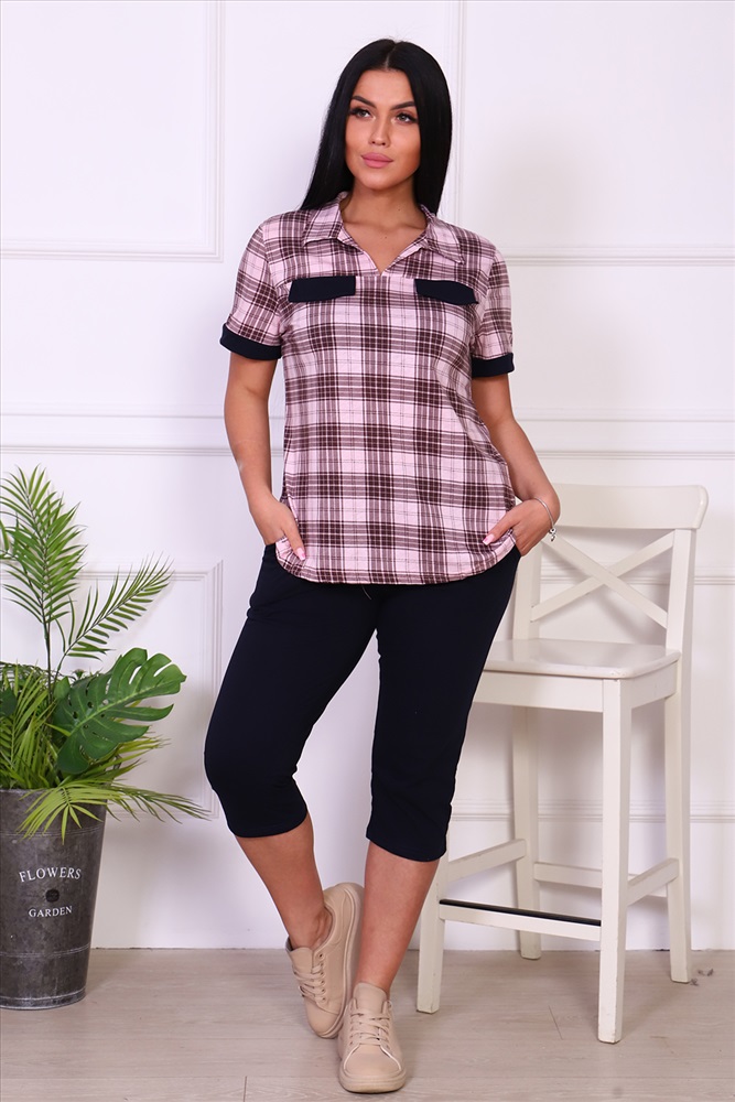 Застежка: без застежки Костюм женский туника и бриджи. Туника свободного силуэта, с коротким рукавом, с накладными фальш-карманами и отложным воротником. Бриджи ниже колена, с карманами. Костюм выполнен из легкого, мягкого трикотажного полотна - 100% хлопок. Вещи из чистого хлопка оптимальны для отдыха и сна. Костюм очень женственный и комфортный.