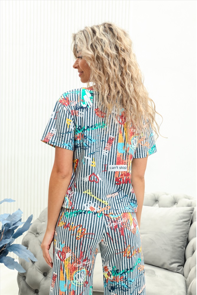 Состав: 100% хлопок Модель: Костюм 11876 Тип товара: костюм с брюками Материал: кулирка | кулирка Бренд: Натали Суслова Карман: боковые Назначение: для дома НДС: 22% Особенности: на резинке Отделка: с карманами Посадка: высокая посадка Рейтинг: Рейтинг 4 и выше Рисунок: геометрия | полоска | цветы Рукав: короткий рукав Сезонность: лето | осень | весна | зима Силуэт: свободный Скидка: любая | от 10% и больше Стиль: домашний Воротник: без воротника Застежка: без застежки Домашний комплект с брюками - кюлотами и футболкой. Брюки с карманами. Длина 7/8. Футболка с коротким рукавом прямого силуэта. Таблица размеров и веса