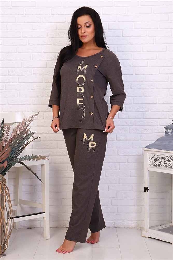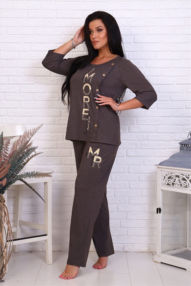 ID товара: 726843 Состав: 50% Хлопок, 50% Полиэстер Сезон: Демисезон Длина: Полная Фасон: Прямой Рукав: 3/4 Вид застежки: Без застежки Декоративные элементы: Печатный принт Основная ткань: Хлопок | Кулирка Стиль: Повседневный Страна бренда: Россия Страна производства: Россия Костюм женский и кулирного полотна состоит из кофты и брюк. Кофта - прямой силуэт, горловина круглая, рукав 3/4 с манжетом, низ обработан на плоскошовной машине, на полочке отделка из декоративных пуговиц. Брюки - прямого кроя, верх на поясе с резинкой, в боковых швах карманы, низ брюк обработан на плоскошовной машине. На полочке и брюках принт. Комментарии к товару