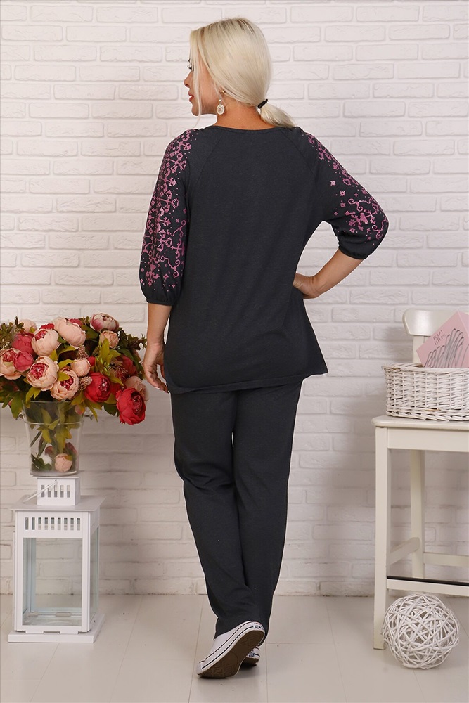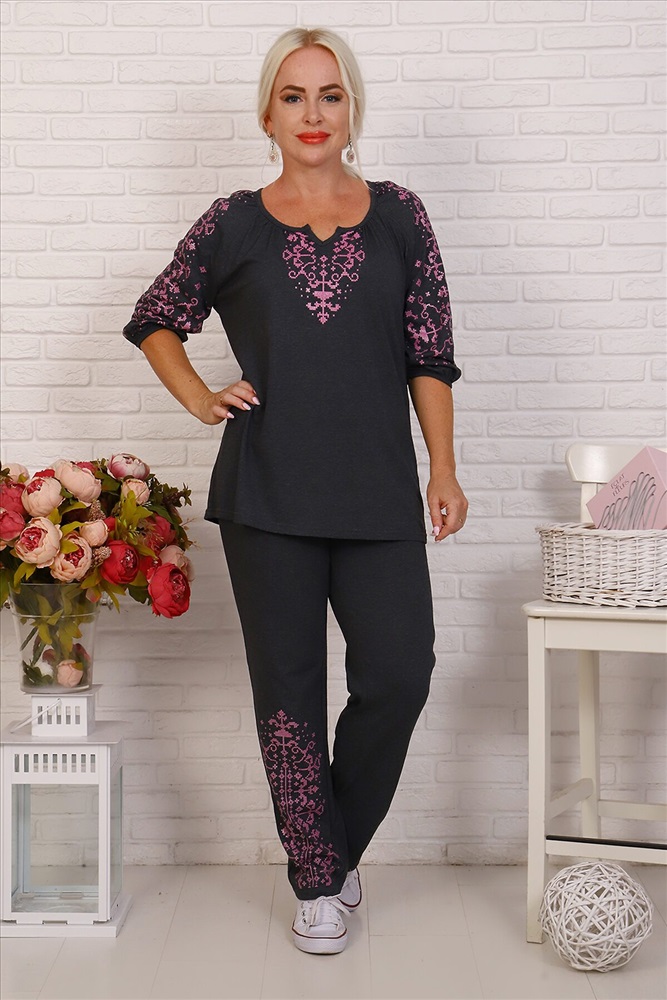 Костюм женский из кулирного полотна состоит и кофты и брюк. Кофта - прямой силуэт, фигурная горловина, 3/4 рукав, декоративная сборка на горловине и рукавах. Брюки прямые, верх на резинке, в боковых швах внутренние карманы. На полочке, рукавах и брюках принт.