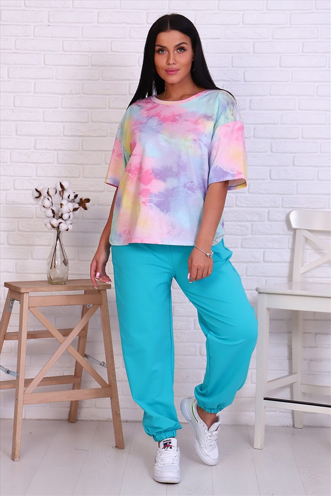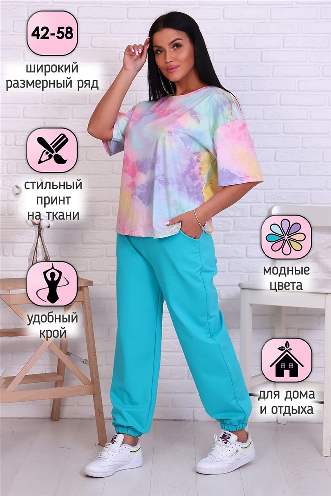 Костюм женский состоит из футболки и брюк. Футболка свободного силуэта со спущенной линией плеча из трикотажного полотна с ярким принтом. Рукав втачной, короткий. Горловина округлой формы, обработана обтачкой. Низ изделия и рукавов подогнут. Брюки из облегченного футера стильного оттенка, свободного силуэта, с притачным широким поясом. Карман формы "хулиган". Низ изделия подогнут с резинкой.