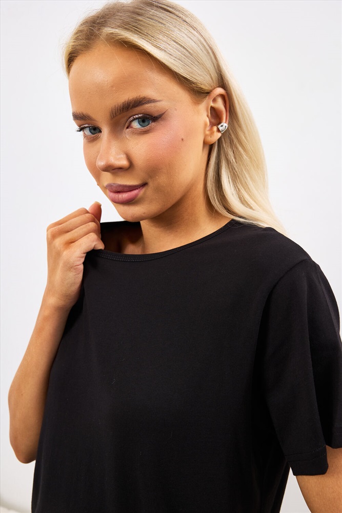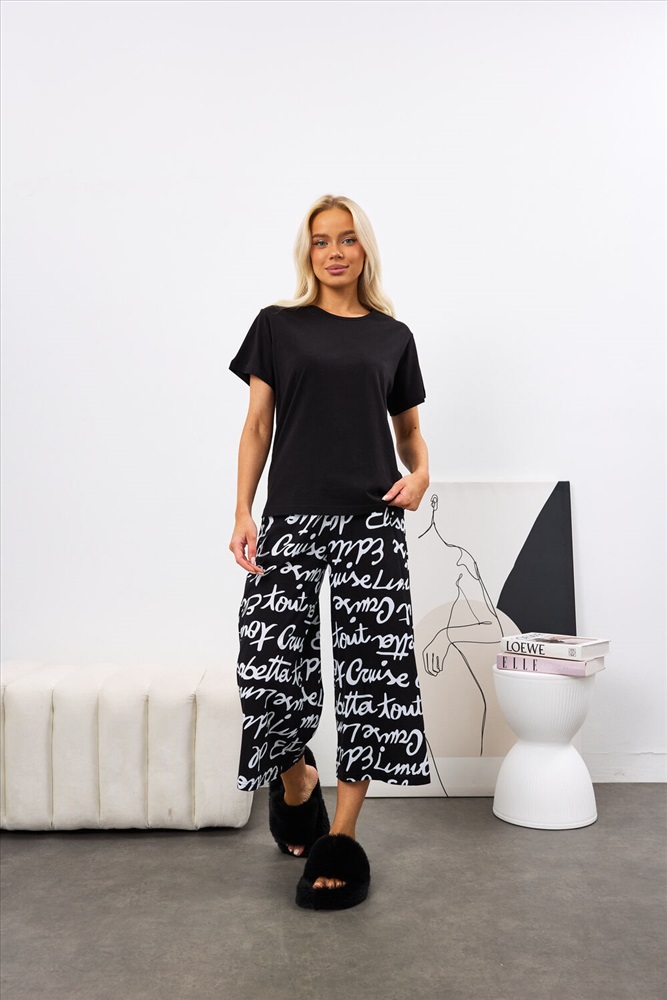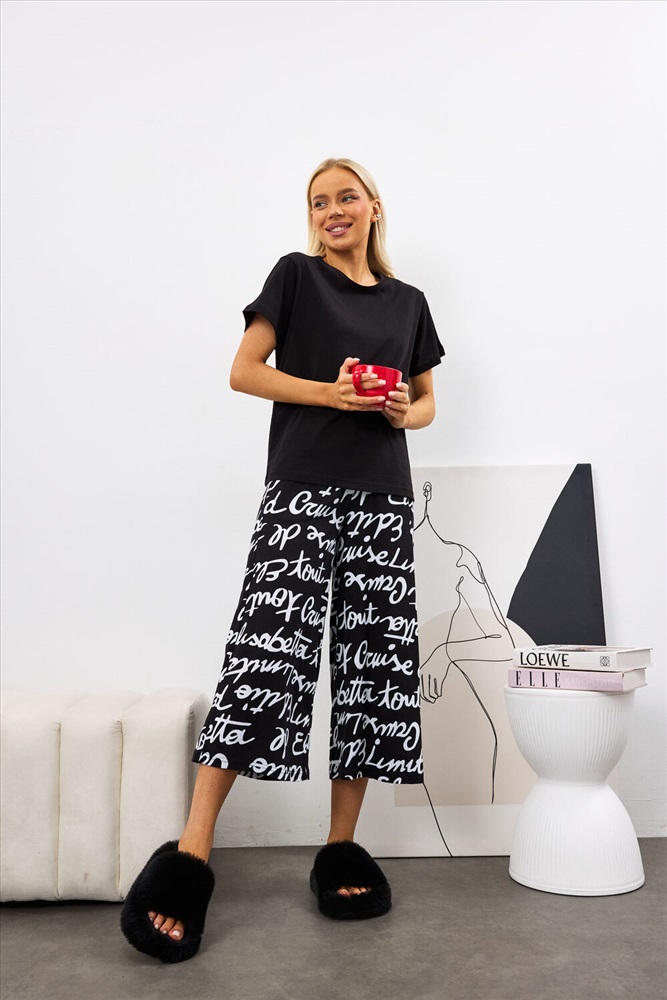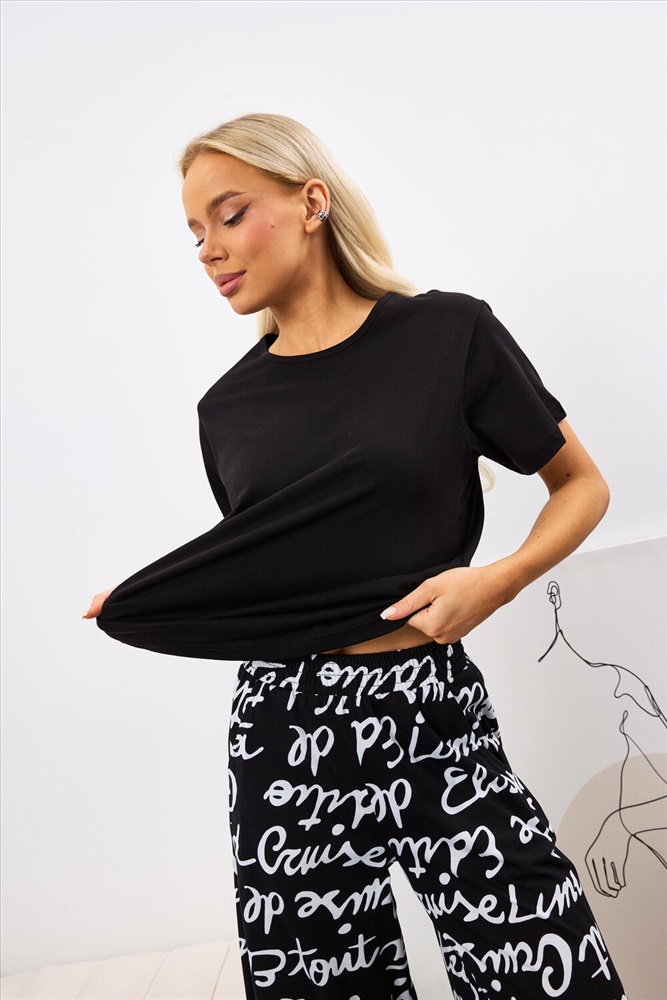 Застежка: без застежки Костюм состоит из футболки и брюк, выполненных в черном цвете. Футболка прилегающего силуэта с коротким рукавом и поясом на резинке, что обеспечивает удобную посадку. Брюки кюлоты укороченные к низу, с двумя боковыми карманами и поясом на резинке. Костюм изготовлен из 100% хлопка, что гарантирует комфорт и приятные тактильные ощущения при носке.