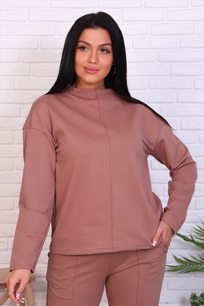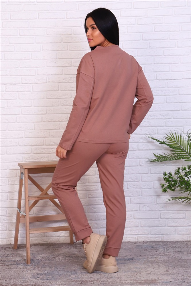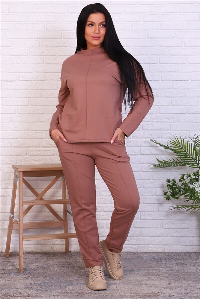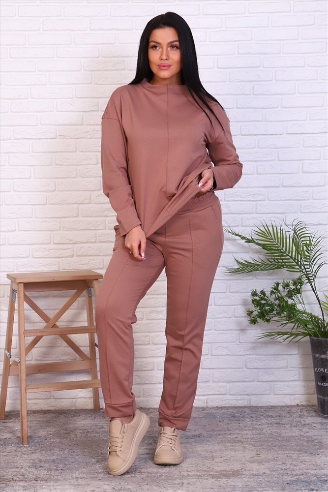 Стильный базовый костюм из хлопкового трикотажа отличного качества. Брюки прямого кроя, зауженные к низу, высокая посадка с простроченными стрелками, низ без резинки(не режет ногу), карманы в швах. Трикотажный джемпер длиной до середины бедра. По центру переда декоративный вертикальный защип вытягивает и стройнит. Горловина джемпера с цельнокроеной стойкой, обработана притачной обтачкой. Рукава джемпера длинный двухшовный, рубашечного кроя, линия плеча спущена. Полные размеры Параметры модели 97-71-101 рост 165. Размер на модели 46-48