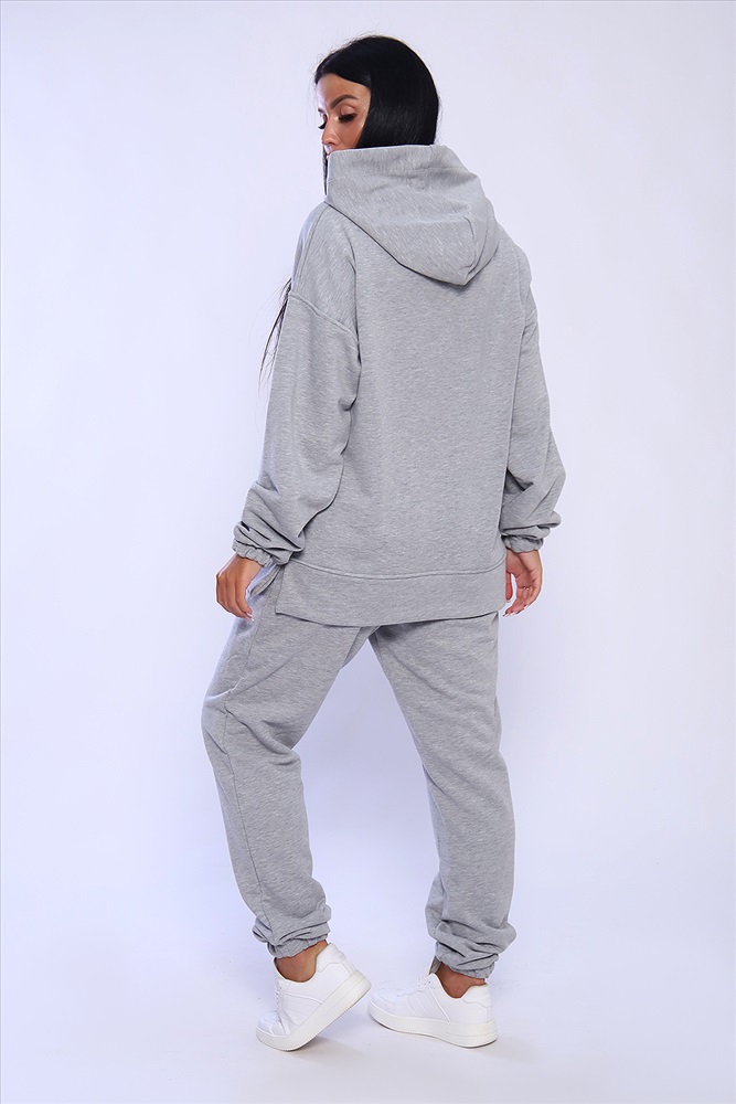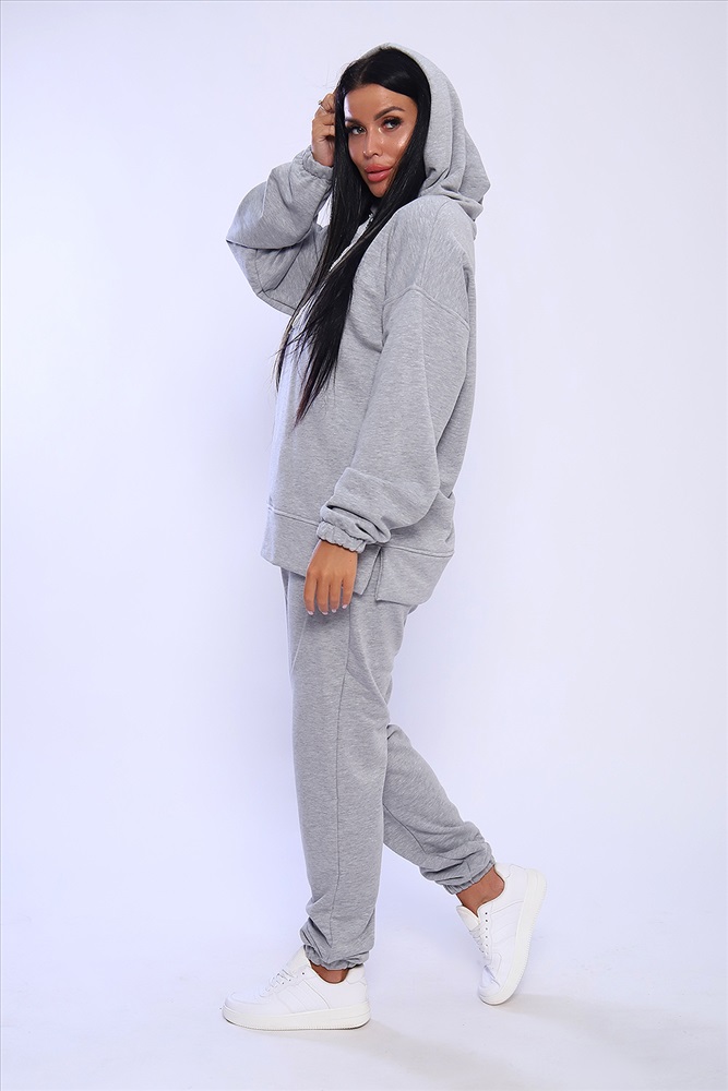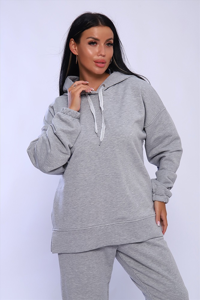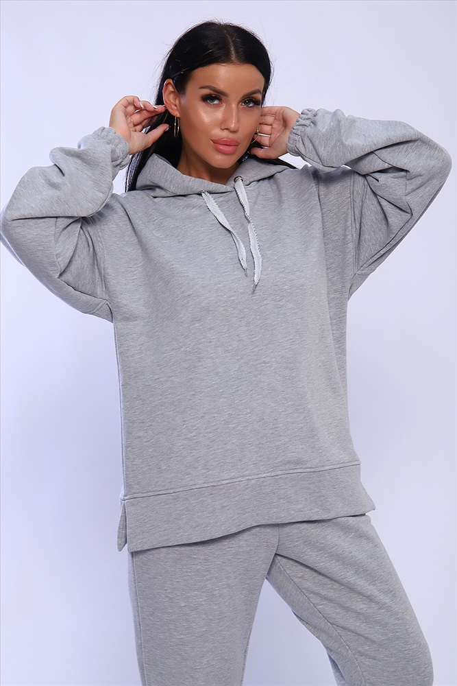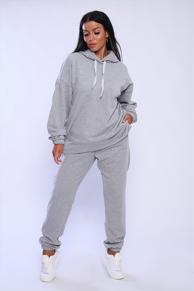 Застежка: без застежки Костюм выполнен из трикотажного полотна футер 3-х нитка диагональ петля (100% хлопок). Толстовка свободного силуэта, имеет капюшон с люверсами и шнурком. Линия плеча спущена (в измерениях длина рукава указана от шва втачивания рукава), низ рукава обработан резинкой, низ изделия обработан поясом с разрезами в боковых швах. Брюки имеют притачной пояс с резинкой и карманы в боковых швах. Низ брюк обработан резинкой. Ткань Костюма плотная, теплая, приятная к телу, согревающая в прохладную погоду, данная модель не обтягивает фигуру, скрывает мелкие огрехи силуэта, комплект уместен для носки в любых повседневных ситуациях и подходит для любого типа фигуры. Рекомендуемый режим стирки 30 t.