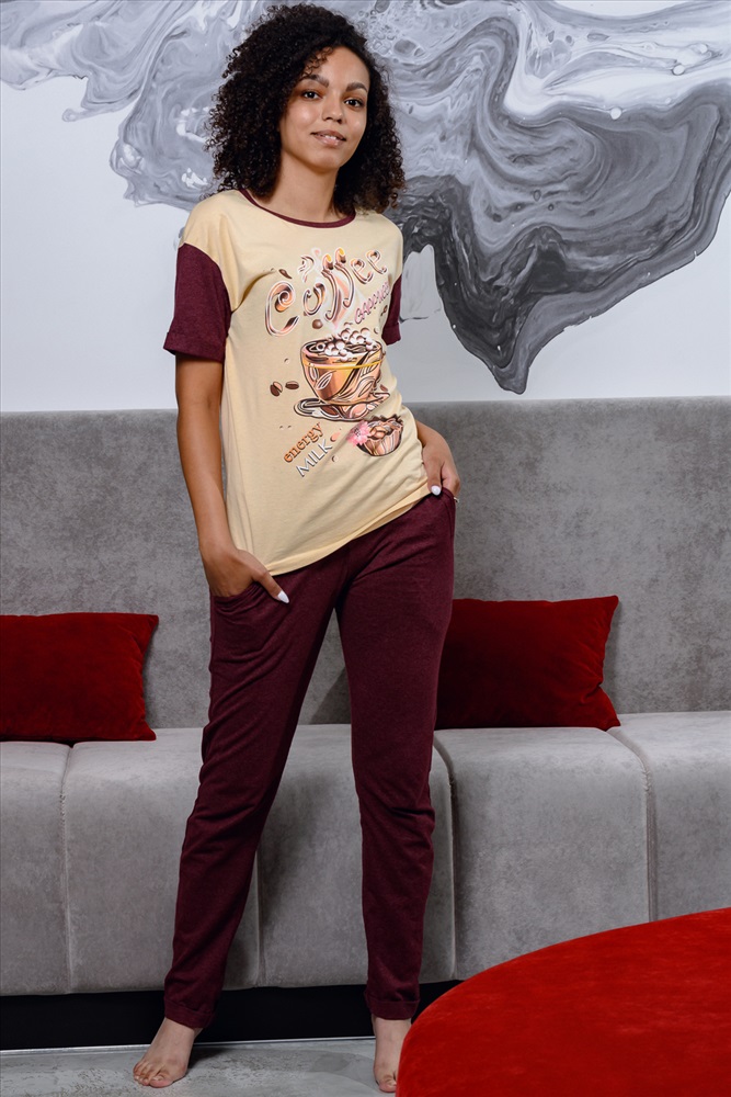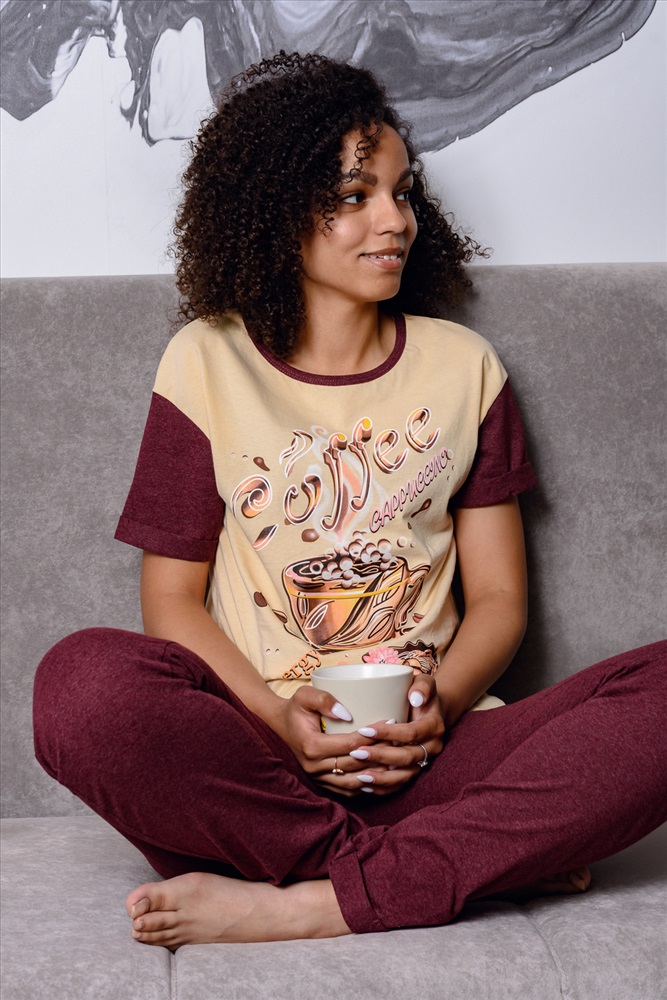 Состав: верх-100% хлопок, низ 70% хлопок, 30% п/э Модель: Костюм 21502 Тип товара: костюм с брюками Материал: кулирка | кулирка Бренд: Натали Суслова Карман: боковые Назначение: для дачи Отделка: с карманами | с манжетами | с печатью Посадка: средняя посадка Рейтинг: Рейтинг 4 и выше Рисунок: фуд-принт | крупный принт Рукав: короткий рукав Сезонность: лето | осень | весна | зима Силуэт: полуприлегающий Стиль: молодежный Воротник: без воротника Застежка: без застежки Домашний костюм с кофейным принтом. Футболка слегка приталенного силуэта со спущенной проймой. Рукава и брюки с цельнокроеными манжетами. Горловина обработана бейкой. Брюки не свободного кроя, заужены к низу. Пояс обработан эластичной широкой резинкой 3 см. В боковых швах карманы. Благодаря наличию в составе ткани полиэстера, колени на брюках не вытягиваются. Оттенок бордо может отличаться Таблица размеров и весафутболка