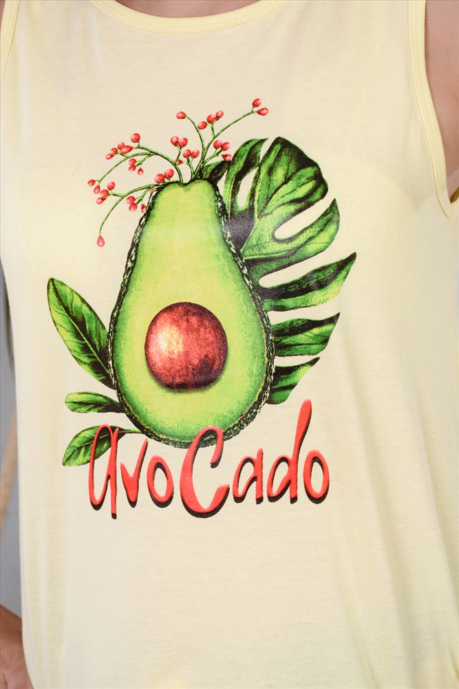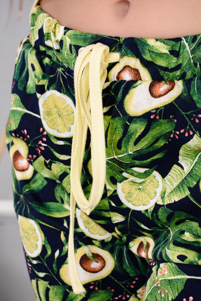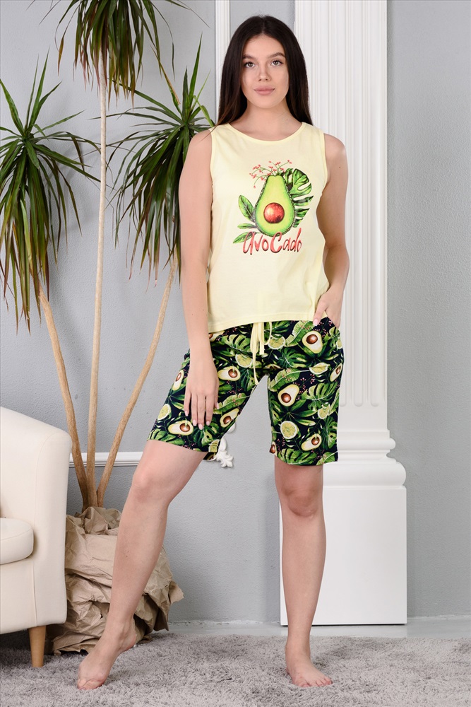 Застежка: без застежки Нежный женский костюм из 100% хлопка - комплект из удлиненных шортиков и майки. Скругленная линия подола спереди и сзади. Разница в длине спинки и полочки в 19 см. На шортах глубокие удобные карманы. Принт - авокадо.