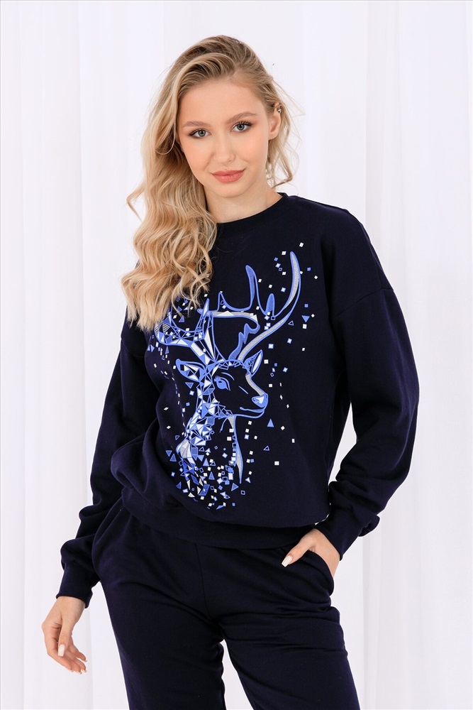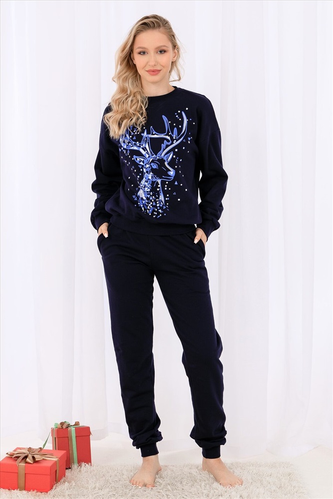 Олени - неотъемлемый атрибут Рождества. Традиция использовать в новогоднем убранстве рождественских оленей завоевала большую популярность во всём мире. В этом уютном удобном костюме из футера с начёсом комфортно находиться в домашней обстановке. В нём можно встретить праздник, использовать в повседневной носке, в качестве подарка. Костюм состоит из свитшота свободного кроя и брючек с карманами в боковых швах. Все манжеты на костюме выполнены из плотной рибаны с лайкрой. Пояс обработан плотной резинкой 3см. После стирки может быть небольшая усадка, поэтому имеется напуск. Длина рукава в измерениях указана от основания шеи.