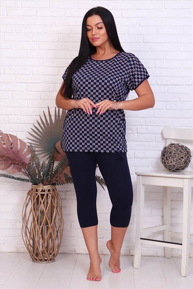 Застежка: без застежки Костюм женский состоит из бриджей и кофты. Бриджи с притачной резинкой, низ изделия обработан швом в подгибку. Низ кофты обработан швом в подгибку с прокладыванием шнурка. По бокам два кармана. Входы в карман, горловина и рукава обработаны контрастной бейкой.