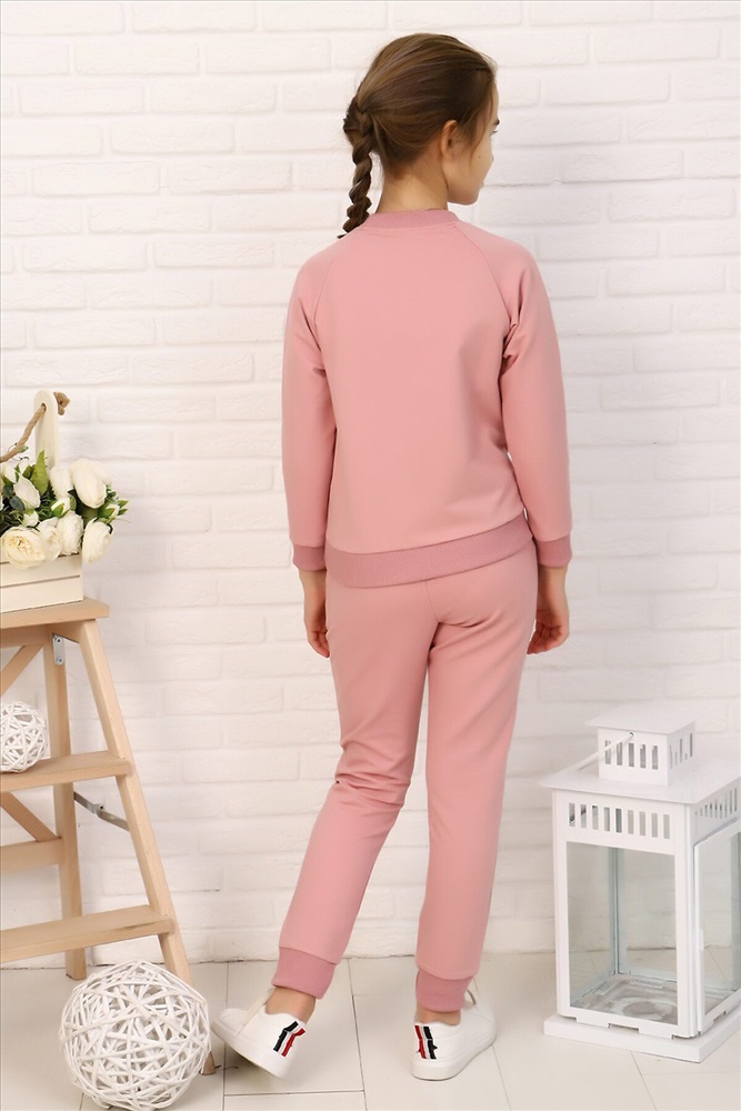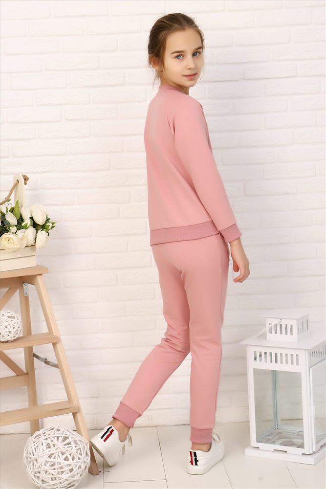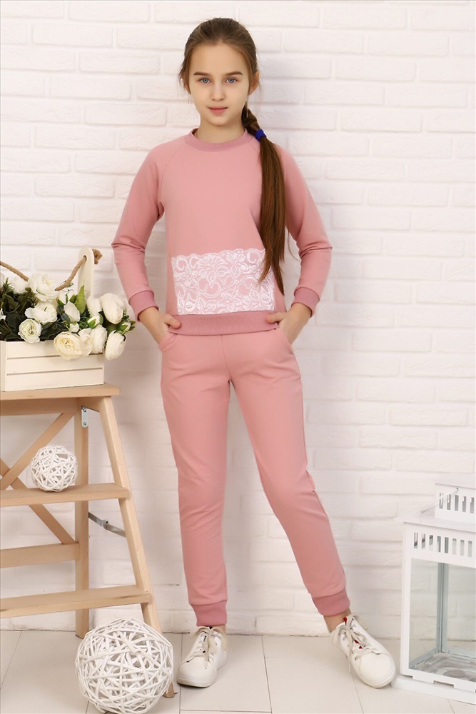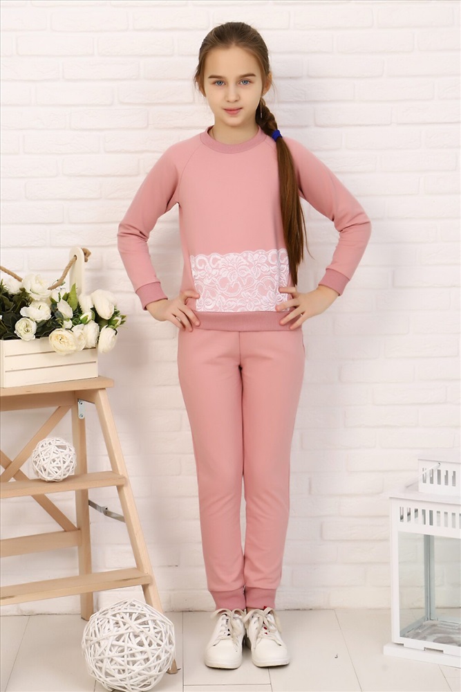 Костюм для девочек. Передняя часть кофты украшена декоративным кружевом. Рукав реглан. На брюках есть боковые карманы, низ брюк на манжете. При оформлении заказа рекомендуем выбрать на размер больше.
