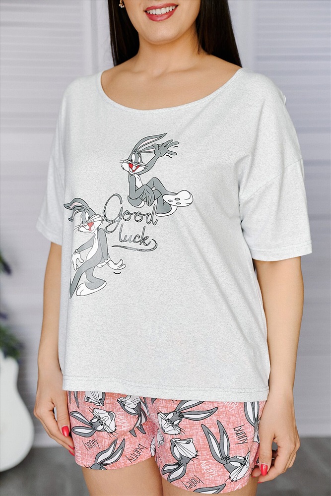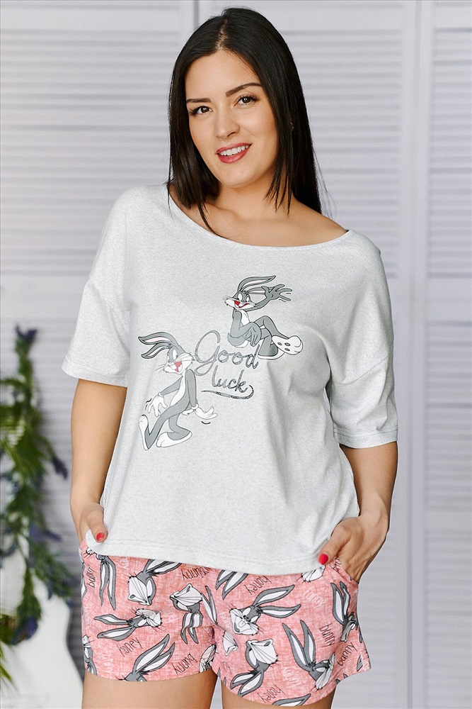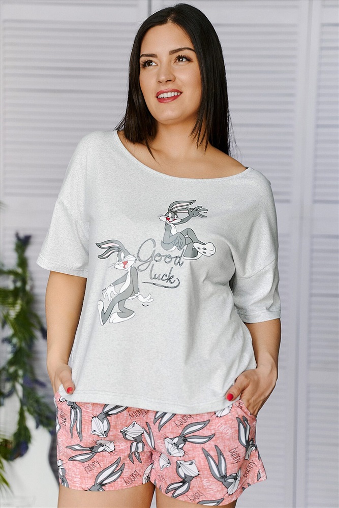 Страна производства: Россия Костюм женский состоит из футболки и шорт. Футболка свободного покроя, на полочке расположена печать. Шорты на поясе с карманами.