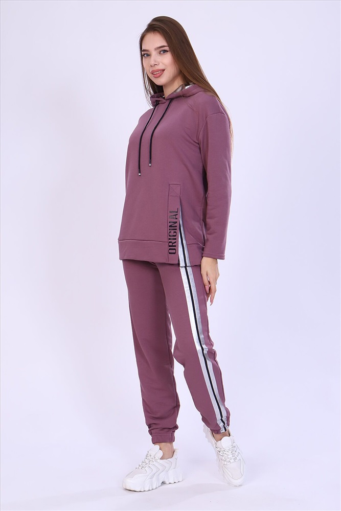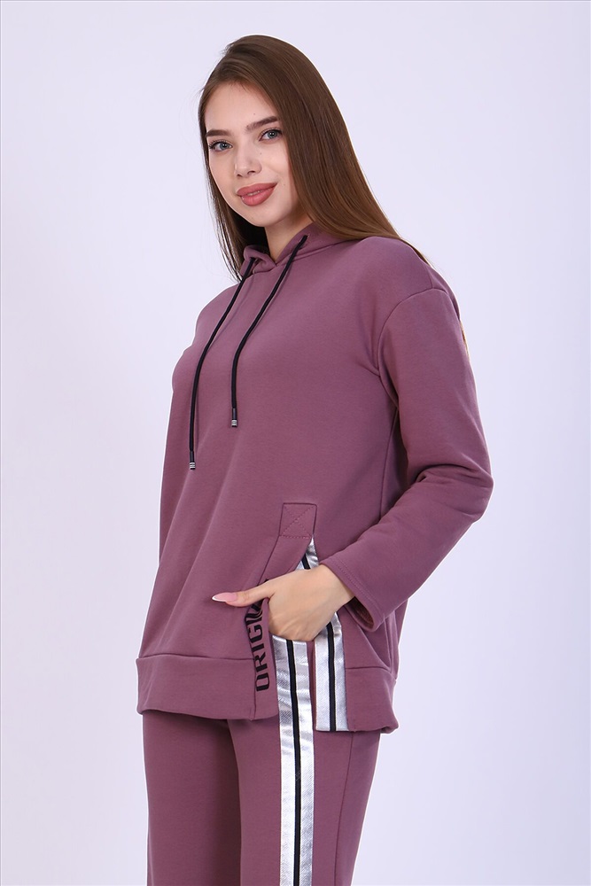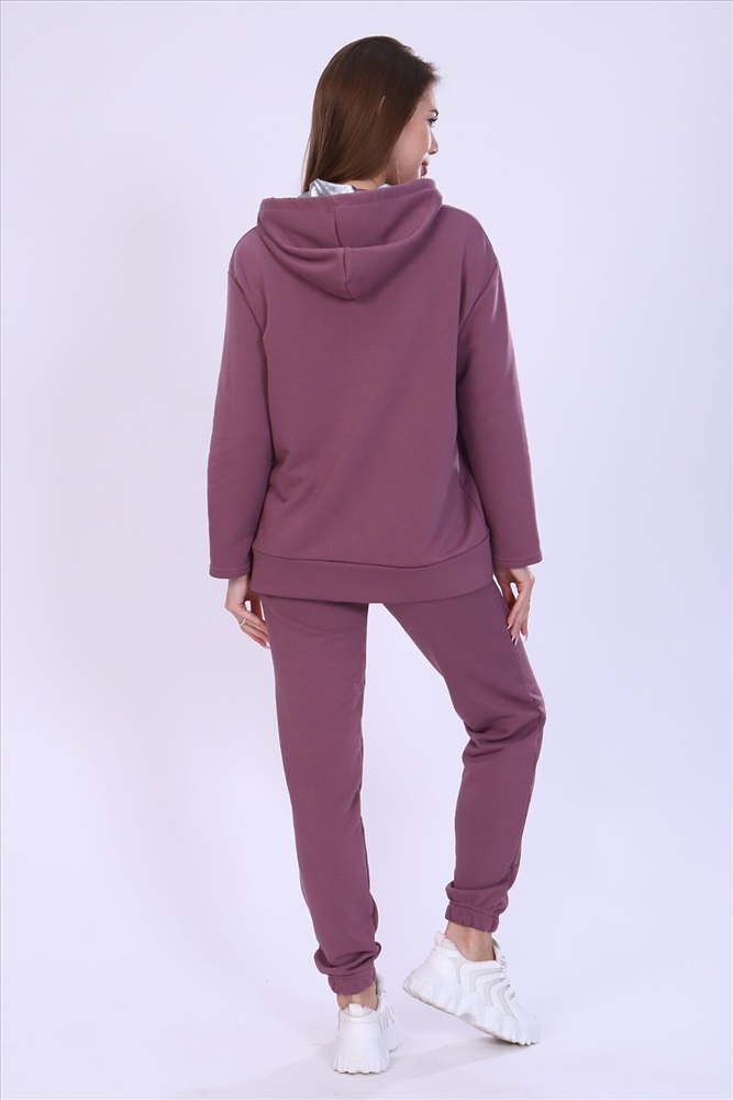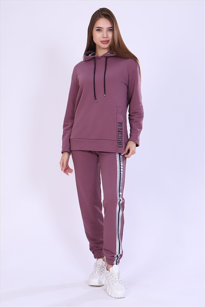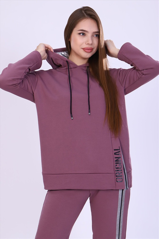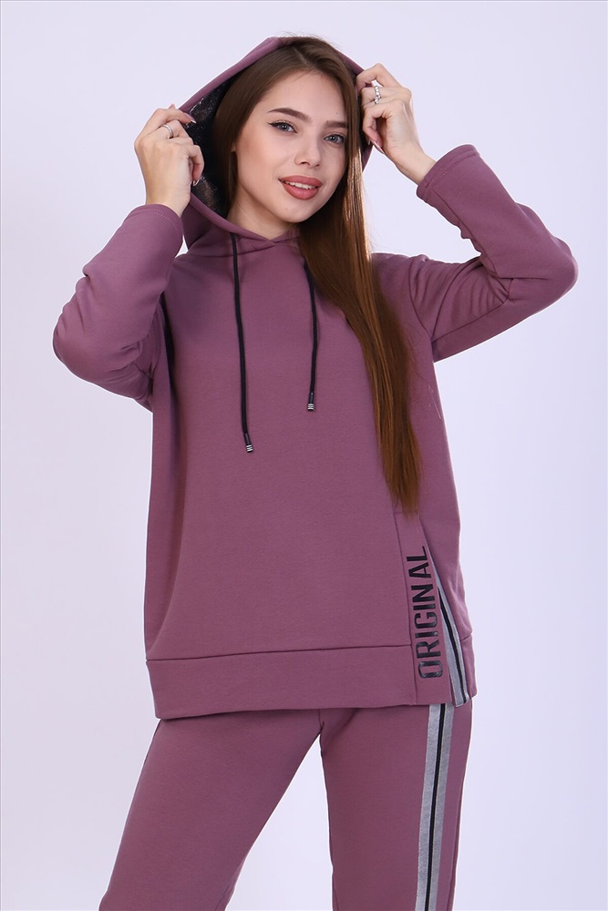Костюм женский с принтом из футера 3-х нитки петля качества пенье. Свободная толстовка с капюшоном, обработанным внутри стильной тканью бифлекс; спущенная пройма, длинный рукав, низ передней полочки декорирован шлицей и принтом в виде надписи. Брюки прямые, полуприлегающего силуэта на распошитом поясе с удобными карманами, слегка зауженные к низу на резинке, украшены принтом в виде имитации лампаса, Тёплый, стильный костюм сделает ваш образ неповторимым. Это отличный выбор на холодную погоду. Благородные цвета изделия придают ему роскоши и элегантности.